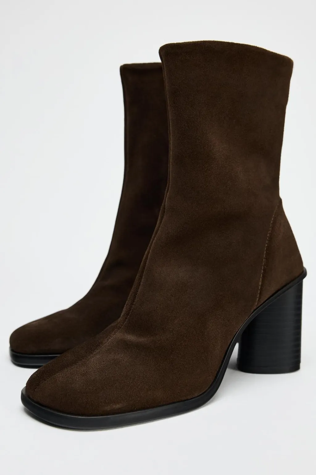 Zapato tipo botín en serraje. Tacón ancho. Cierre mediante cremallera. Acabado en punta redonda.