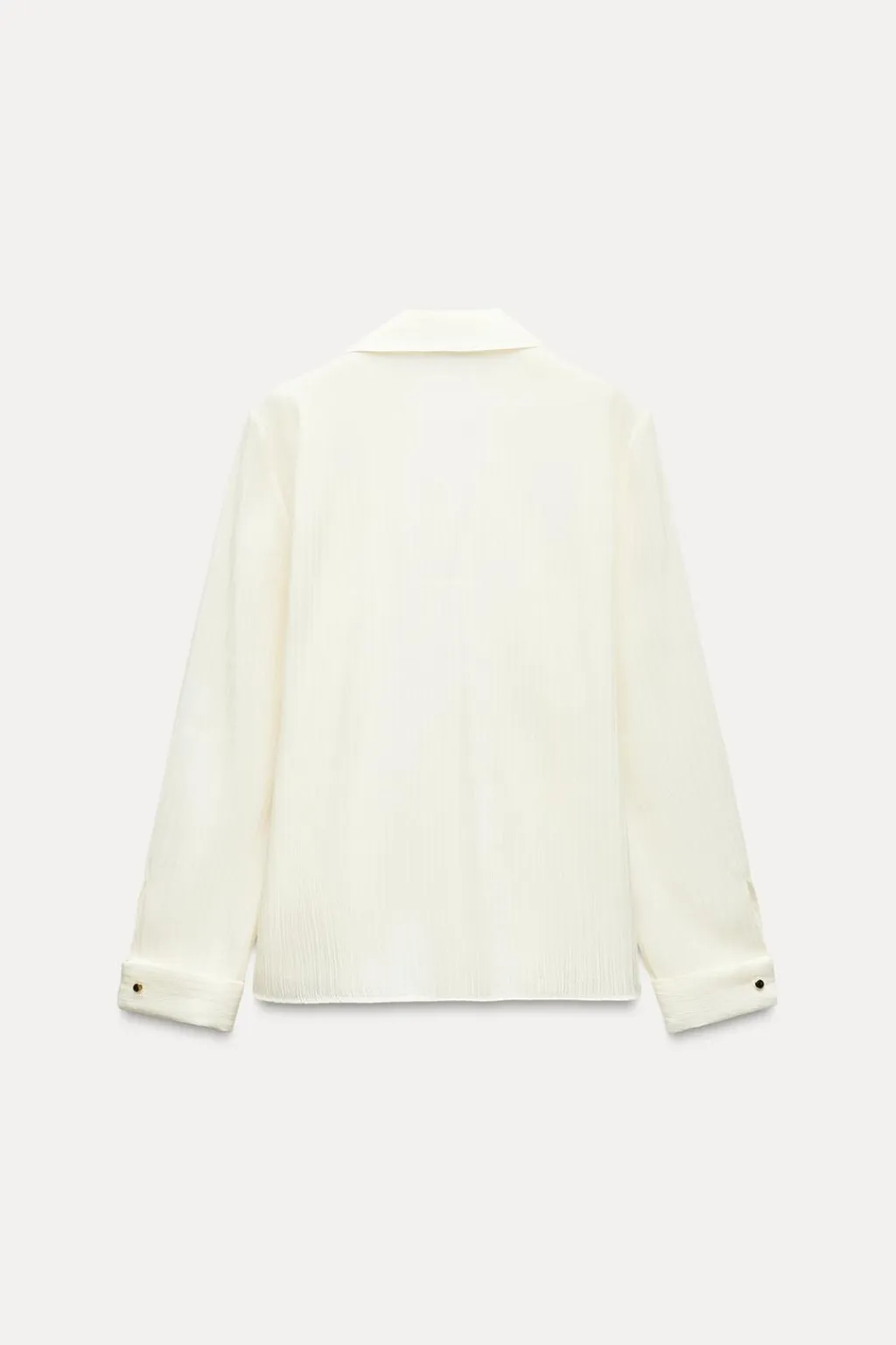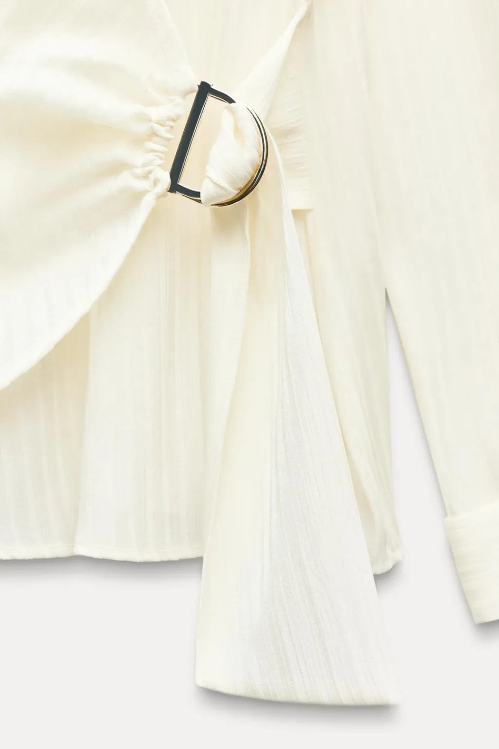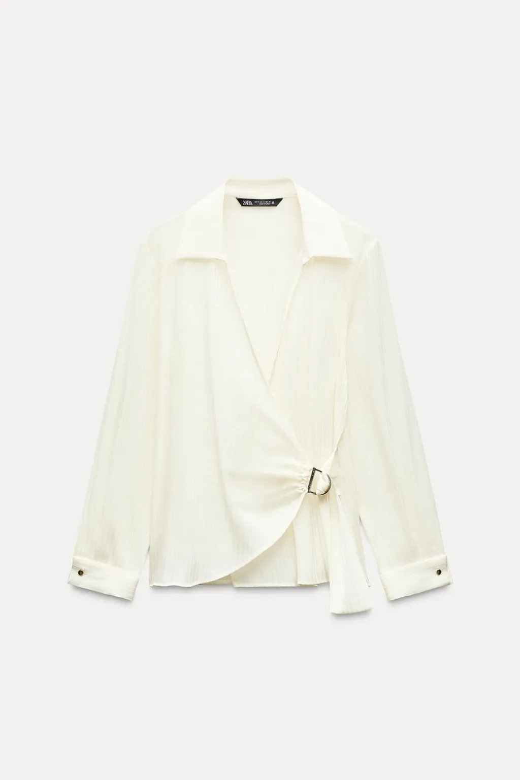 Camisa de cuello solapa y manga larga acabada en vuelta con botón dorado. Delantero cruzado con lazo interior y hebilla dorada. Detalle de tejido con brillo.