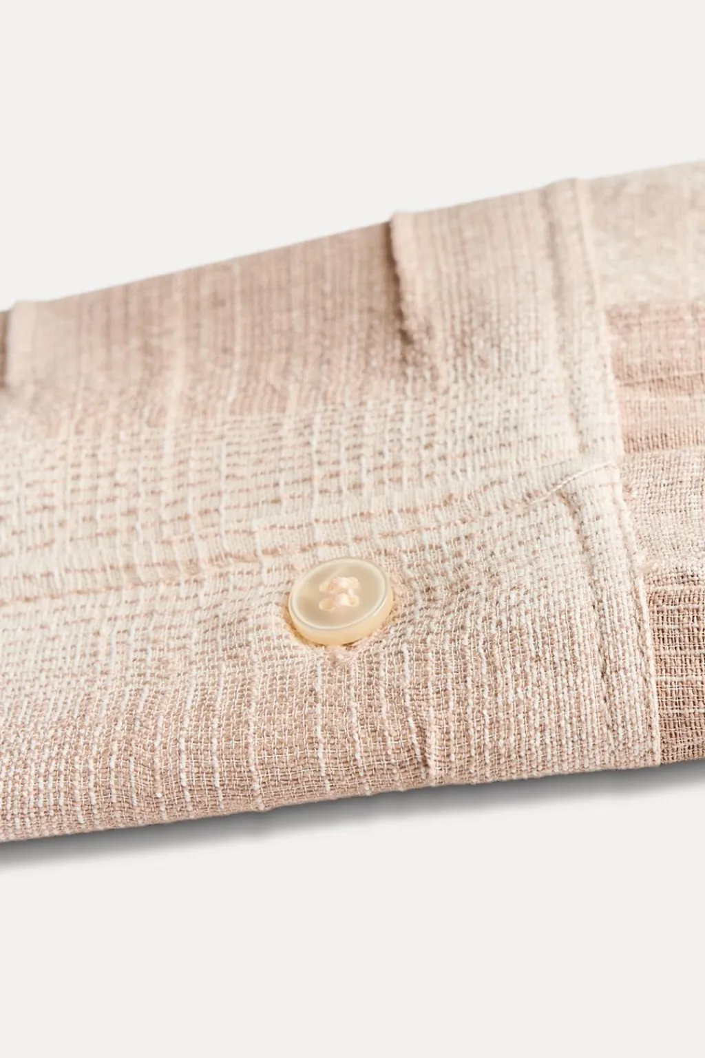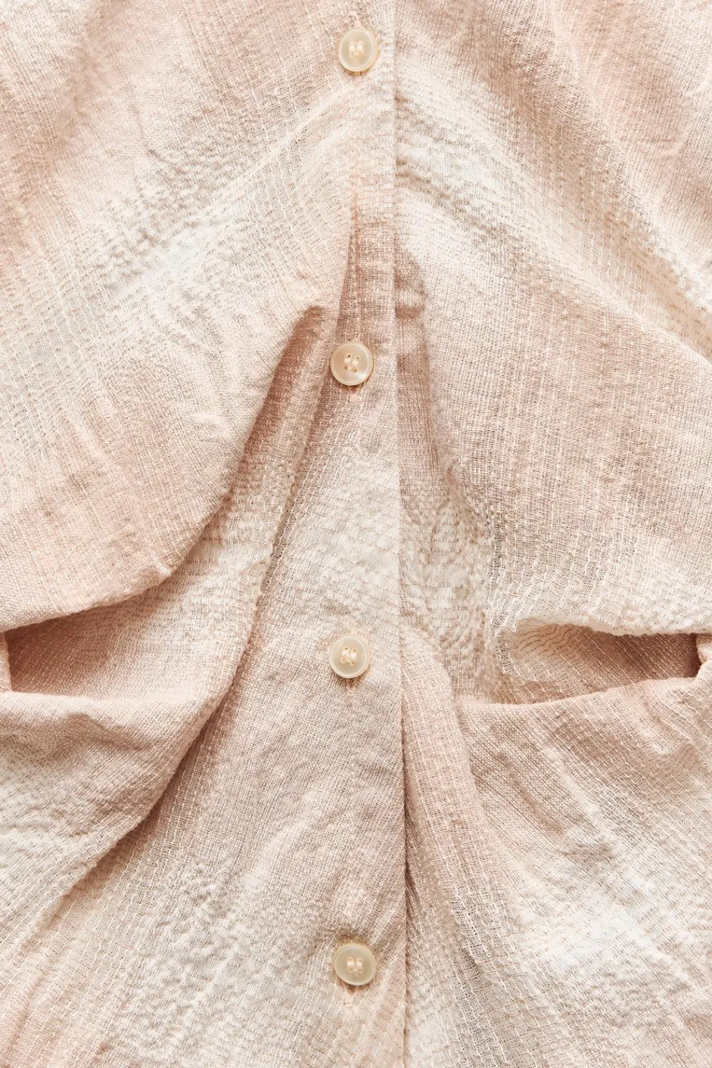 Camisa confeccionada en hilatura con mezcla de algodón. Cuello solapa y manga larga acabada en puño. Detalle de tejido drapeado y lazadas en mismo tejido. Cierre frontal con botones.