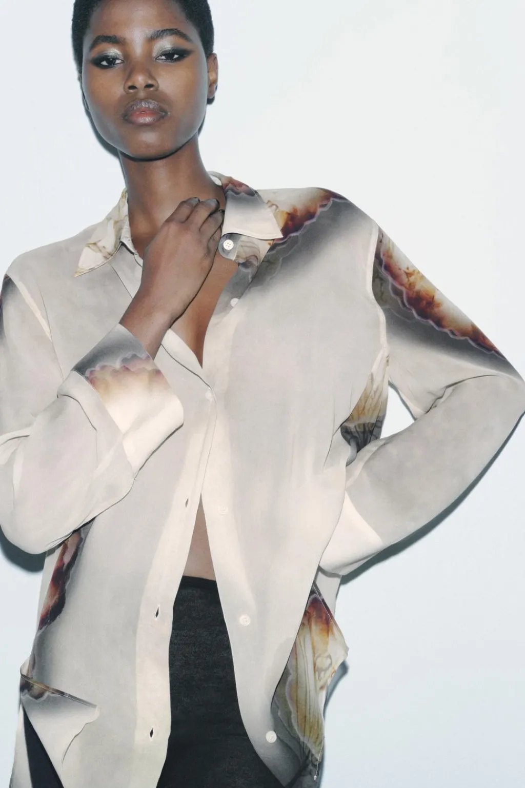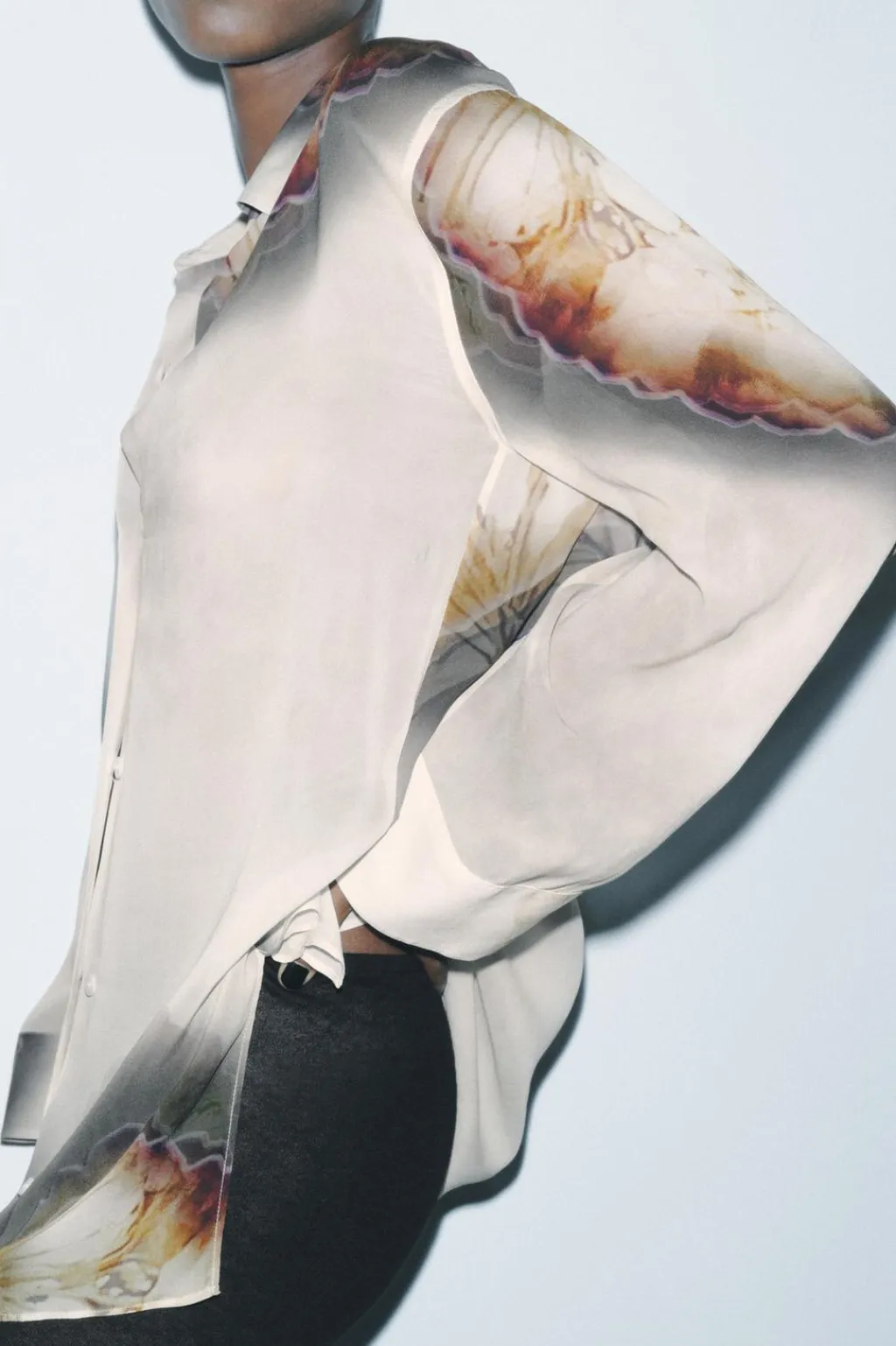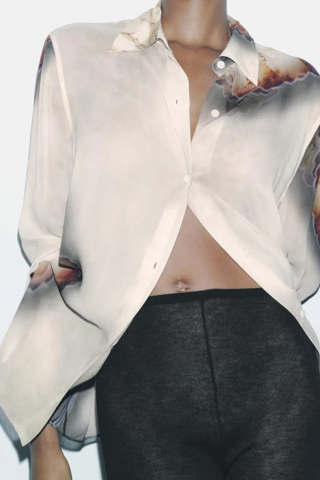 Camisa semitransparente confeccionada en hilatura de viscosa 100%. Cuello solapa y manga larga acabada en puño. Bajo con aberturas laterales. Cierre frontal con botones.