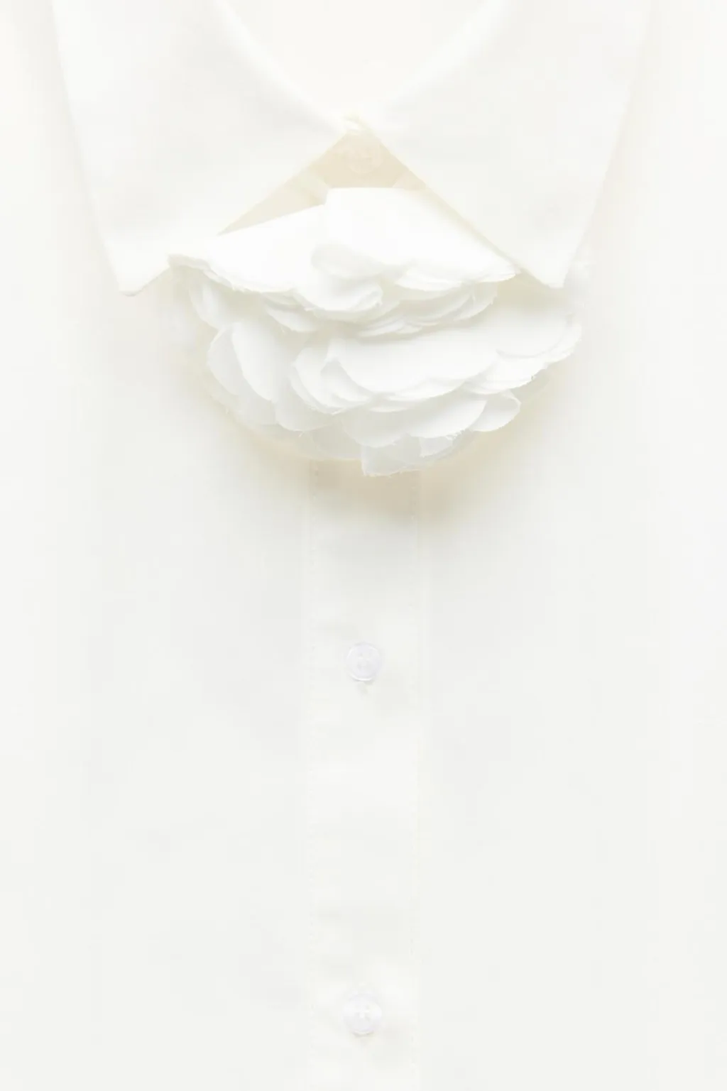 Camisa de cuello solapa y manga larga acabada en puño. Detalle de flor en mismo tejido. Bajo asimétrico. Cierre frontal con botones.