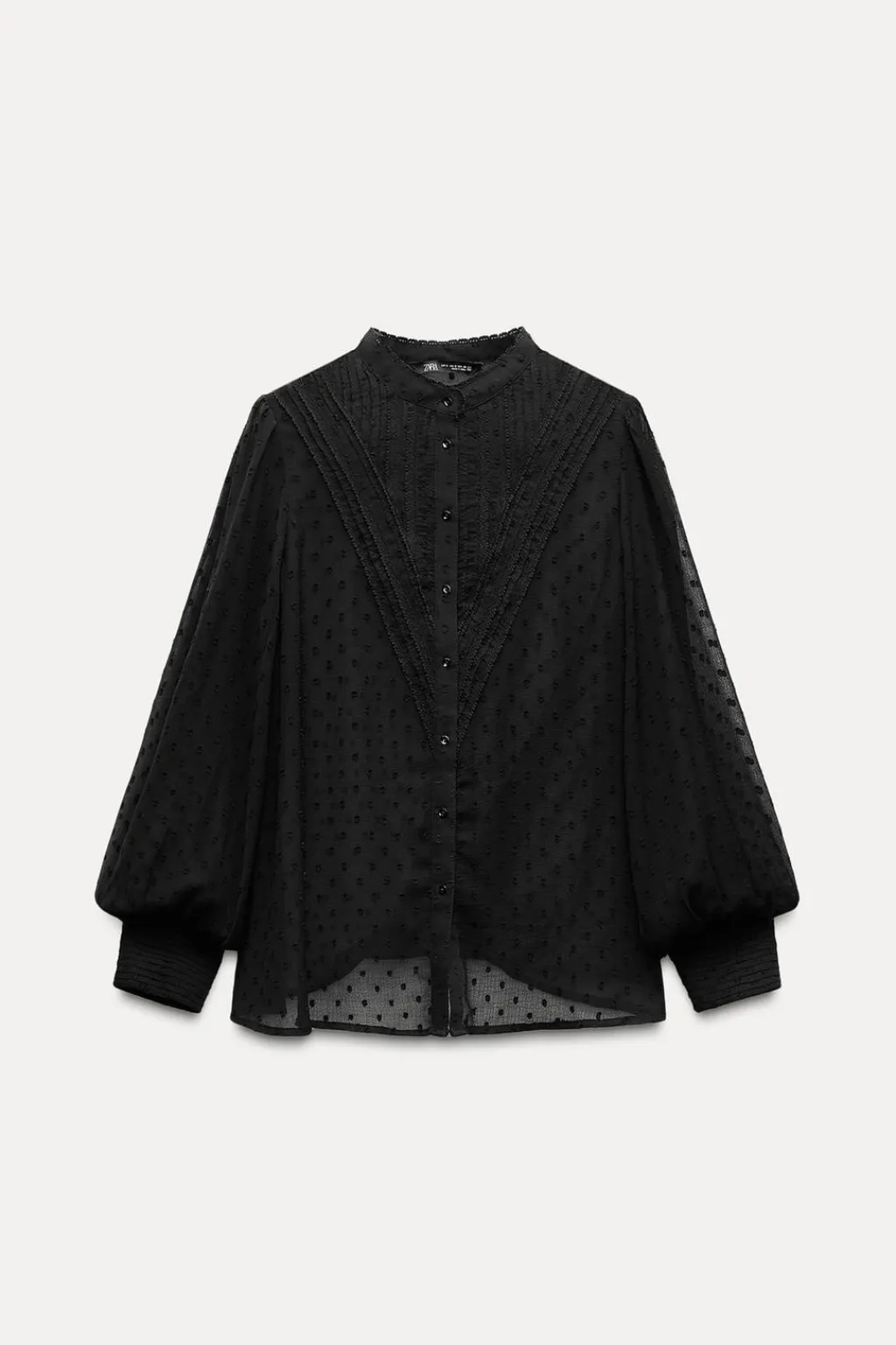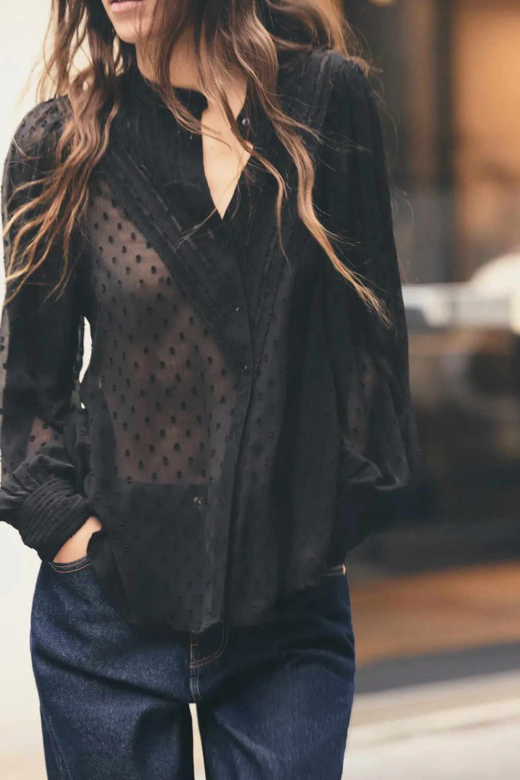 Camisa semitransparente de cuello redondo con puntilla y manga larga. Detalle de jaretas delanteras. Cierre frontal con botones.