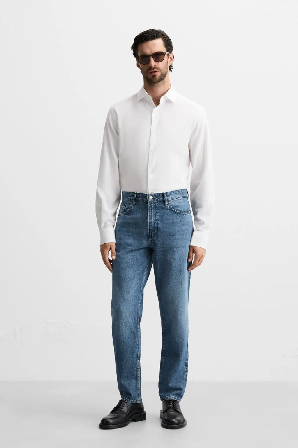 Camisa regular fit confeccionada en tejido de algodón con estructura diagonal. Cuello italiano y manga larga acabada en puño con botón. Cierre frontal de botonadura.