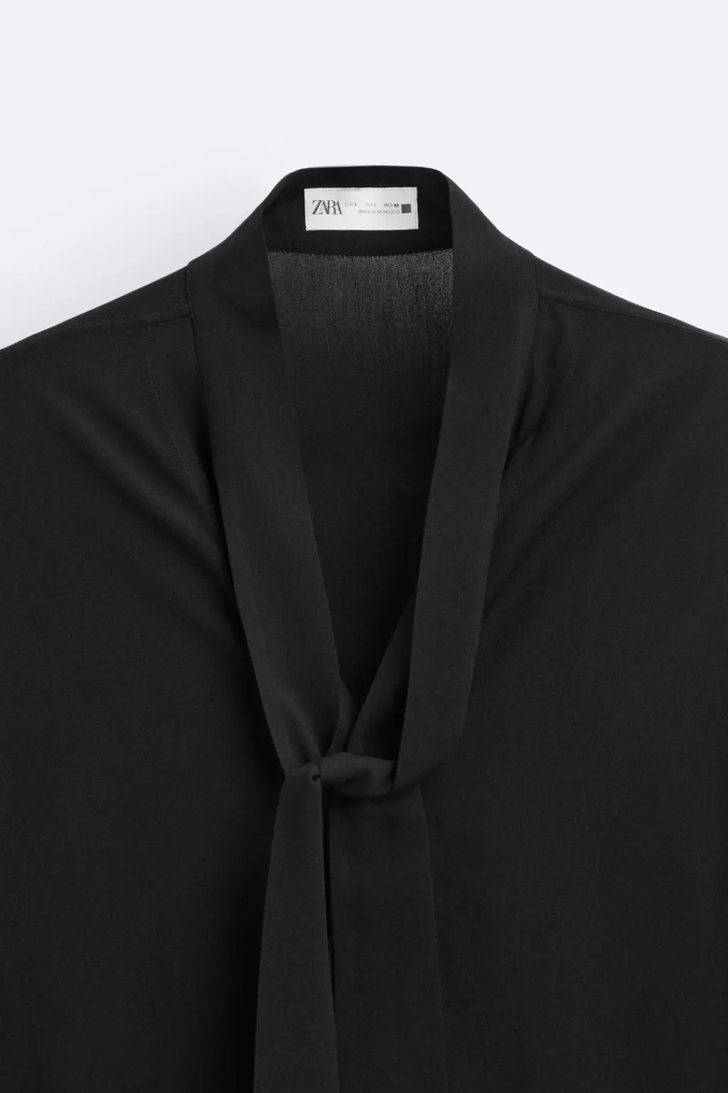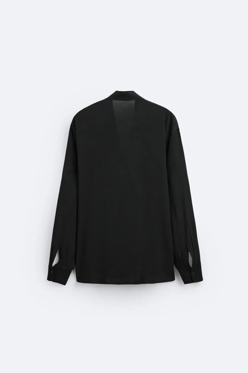 Camisa relaxed fit confeccionada en tejido de viscosa. Cuello tira con lazos. Manga larga acabada en puño con botones. Cierre frontal de botonadura oculta por solapa.