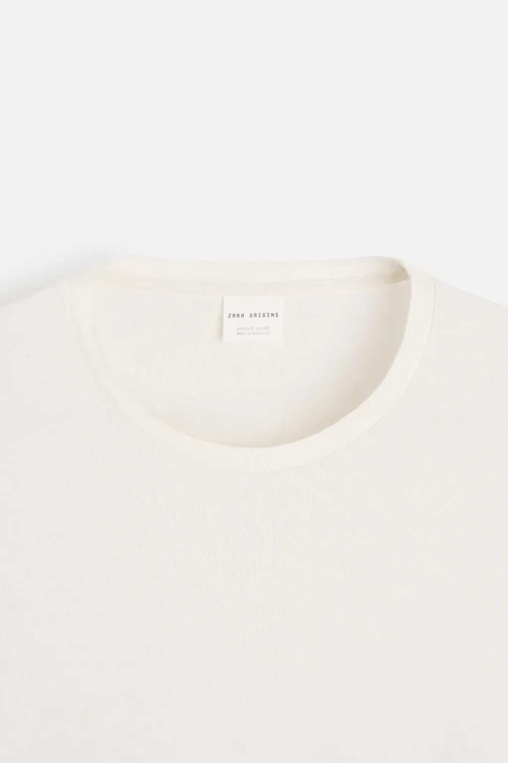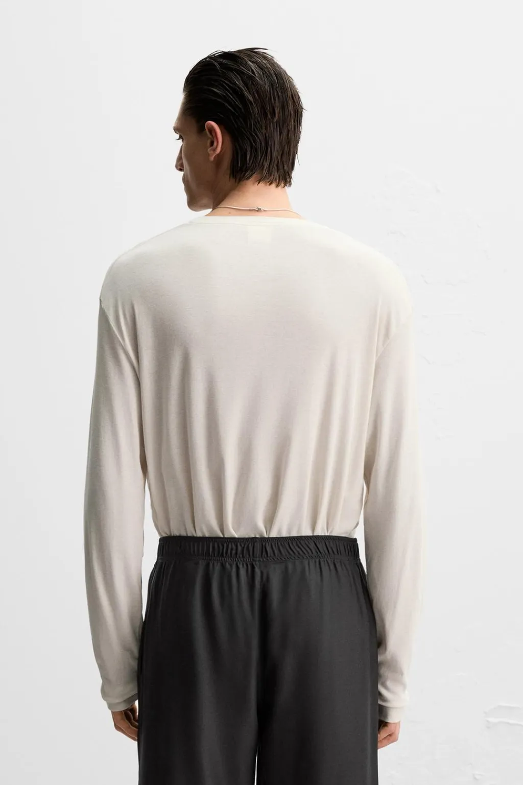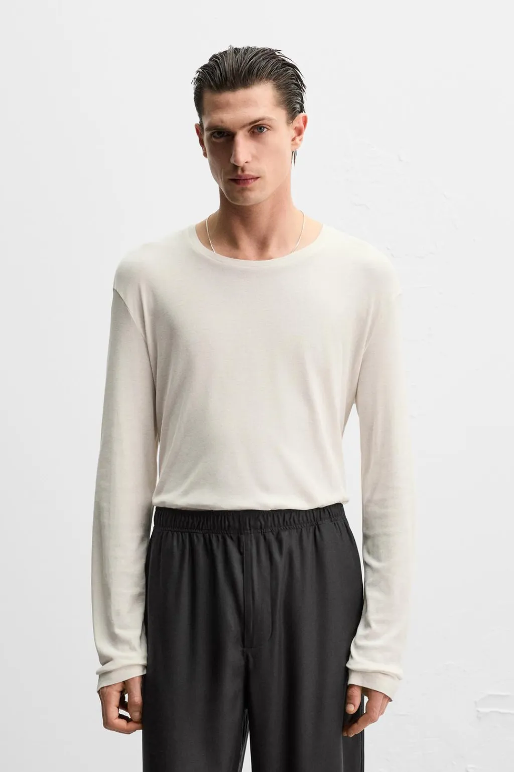Camiseta regular fit confeccionada en tejido ligero de algodón con textura crepé. Cuello redondo y manga larga.