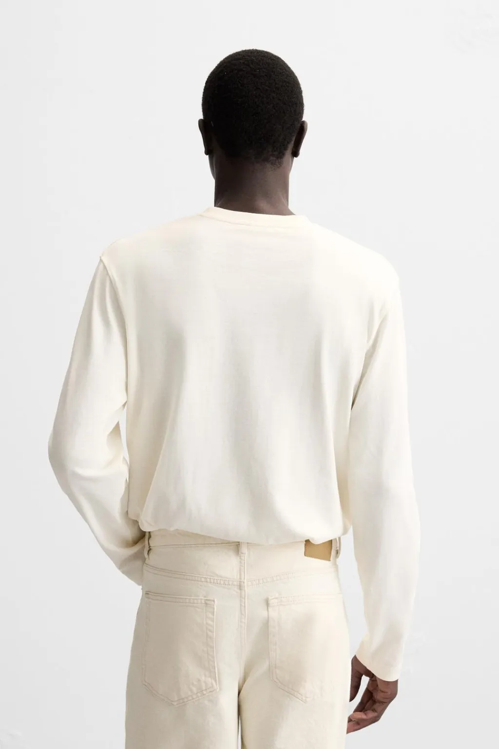Camiseta regular fit confeccionada en tejido compacto de algodón. Cuello redondo y manga larga. Estampación fotográfica combinada a contraste en delantero.