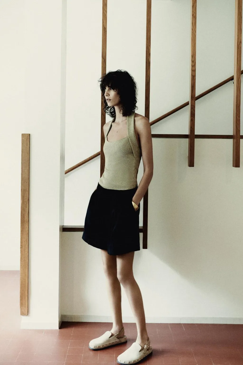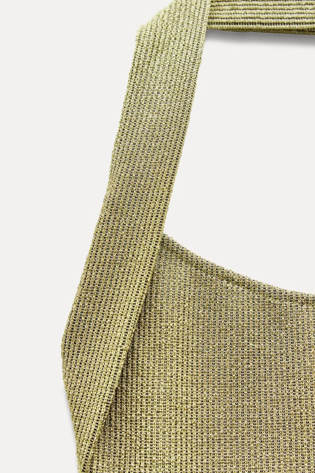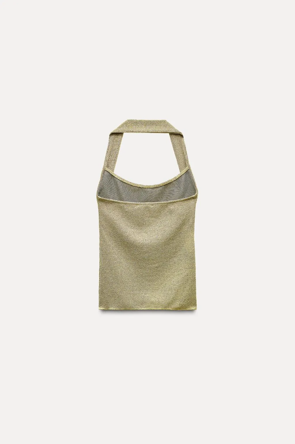 Camiseta halter con escote redondo. Detalle de aplicación de hilo metalizado. Espalda descubierta.