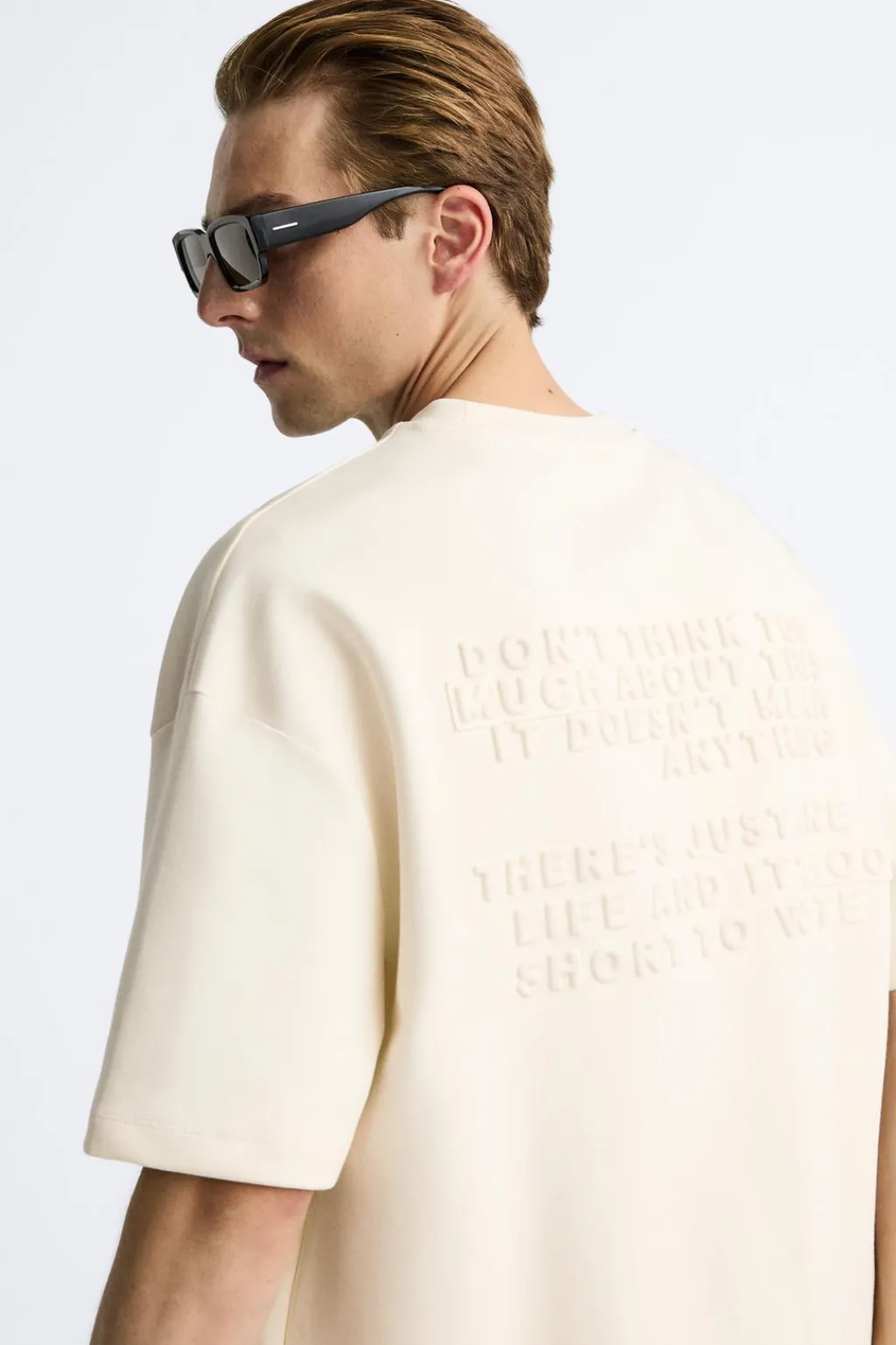 Camiseta relaxed fit. Cuello redondo y manga corta. Detalle de texto con relieve en espalda.