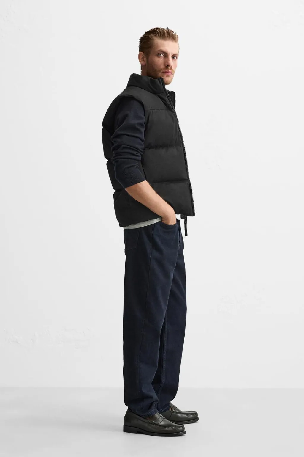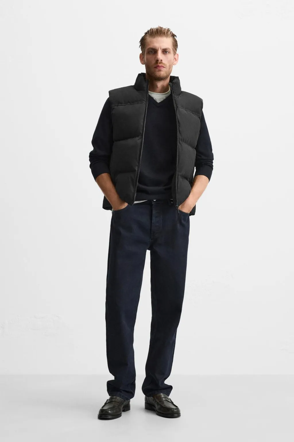 Chaleco acolchado. Cuello subido y manga sisa. Bolsillos de vivo en cadera y detalle de bolsillo interior. Cierre frontal con cremallera.