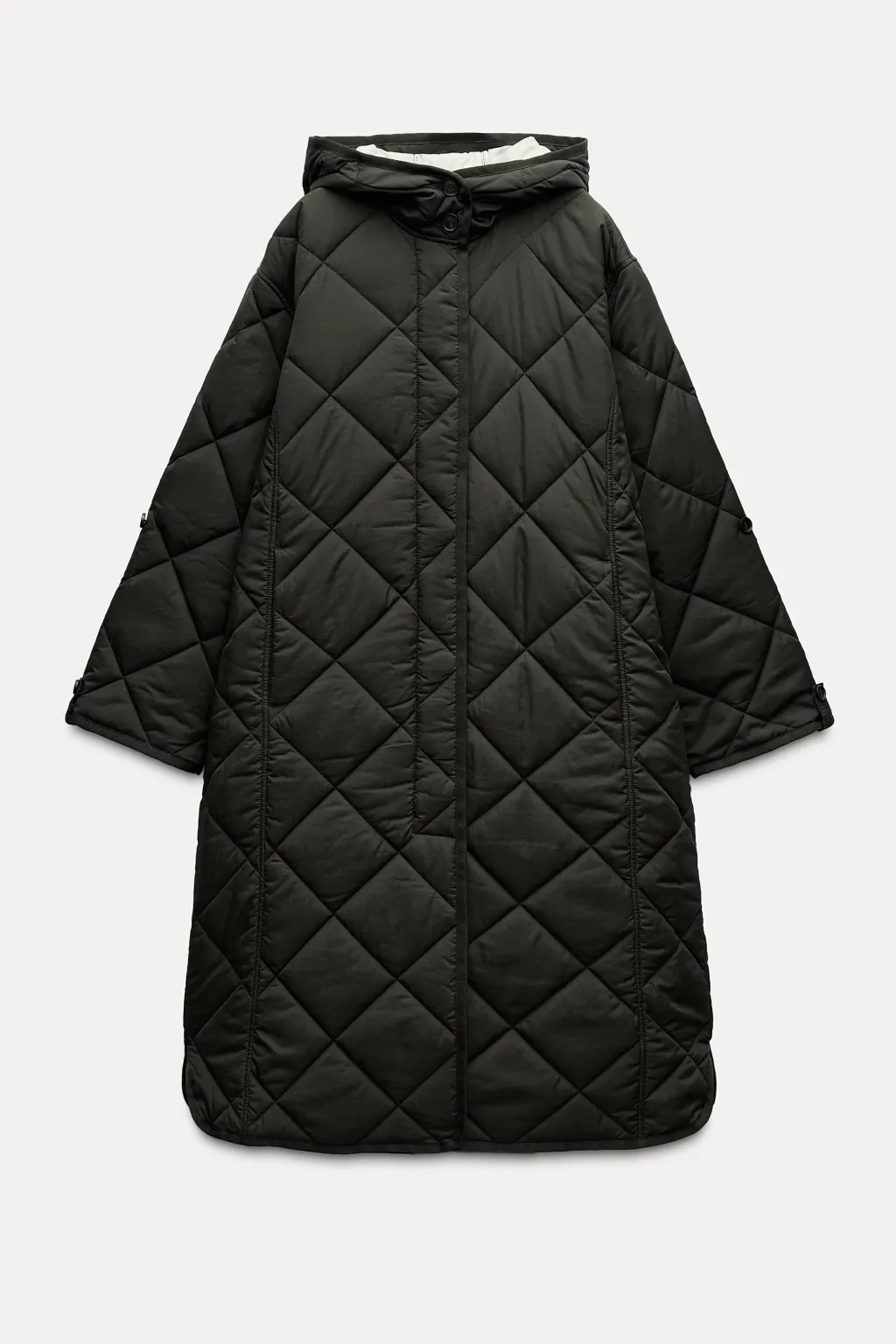 Chaqueta larga acolchada con capucha y manga larga. Bolsillos delanteros. Bajo asimétrico con aberturas laterales. Cierre frontal con botones ocultos por solapa.