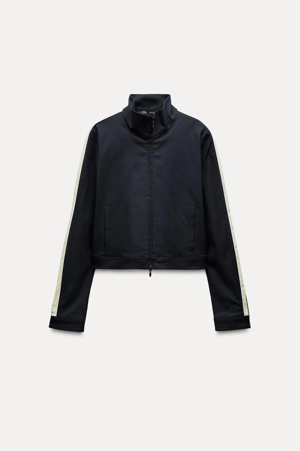 Chaqueta de cuello subido y manga larga. Bolsillos de vivo en delantero. Detalle de bandas combinadas a contraste en mangas. Cierre frontal con cremallera.