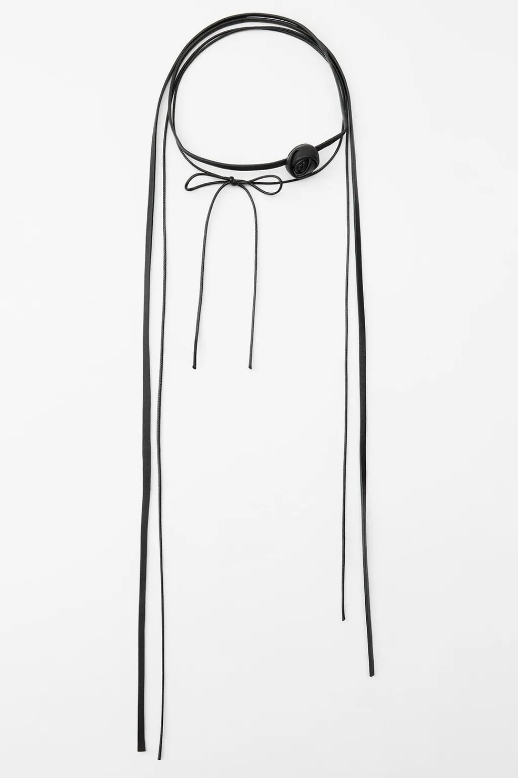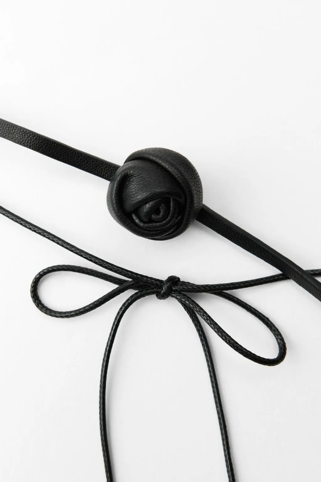 Collar choker doble realizado en piel 100%. Detalle aplicación de flor en mismo material. Cierre con lazadas.