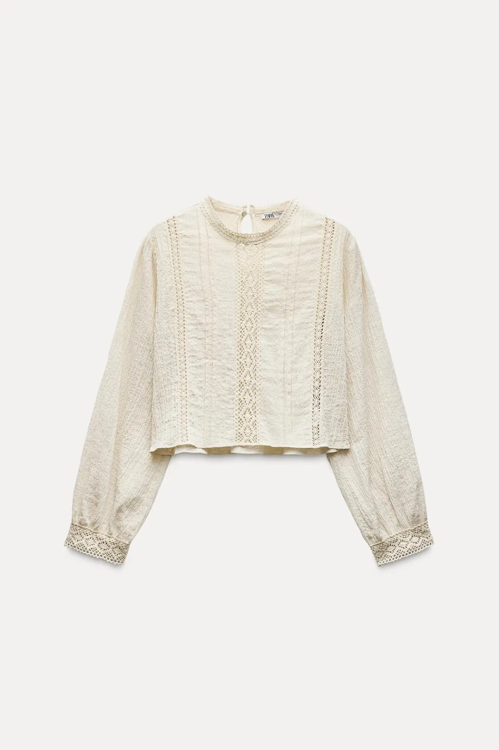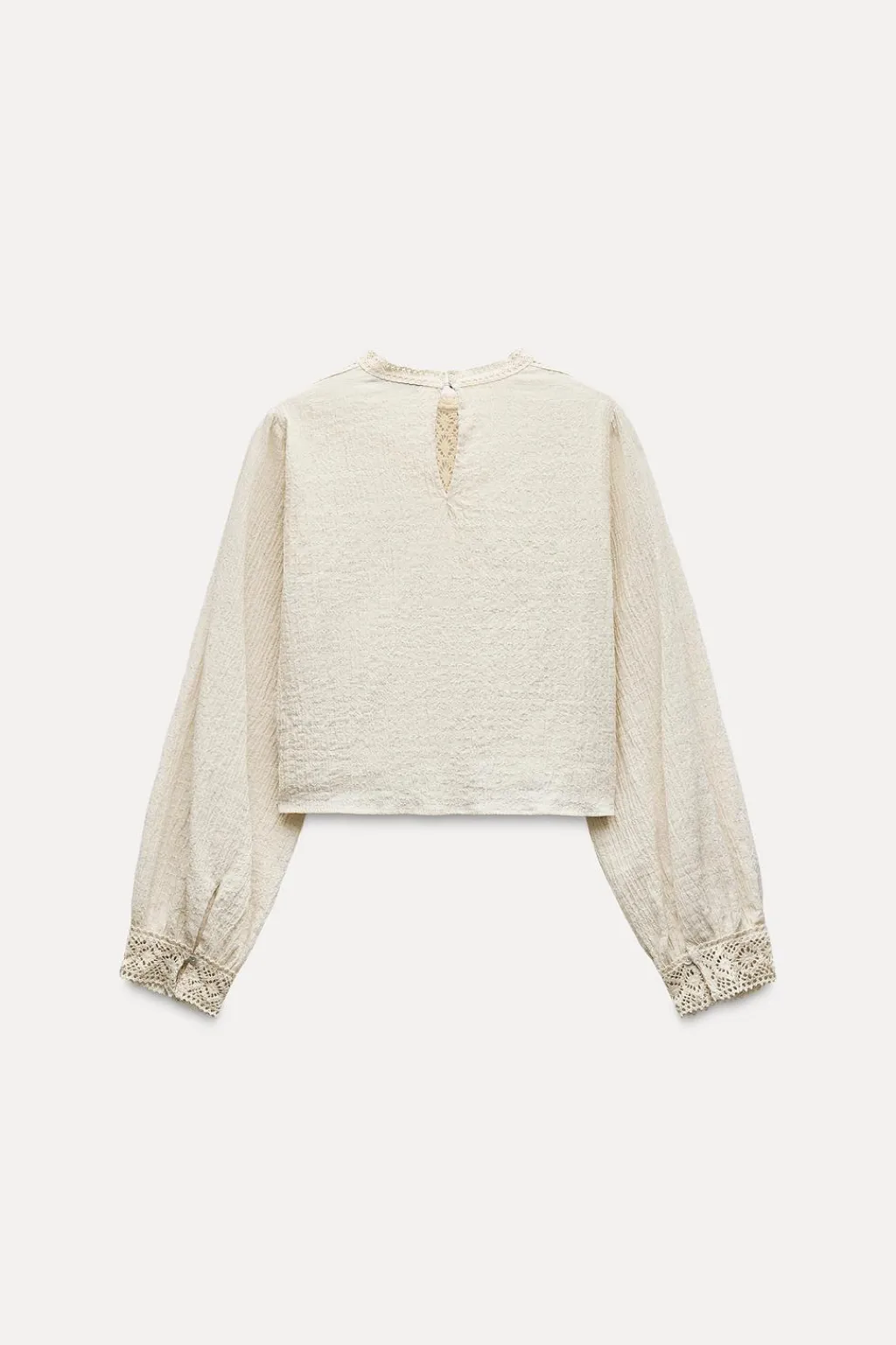 Cuerpo de cuello redondo y manga larga. Manga larga acabada en puño combinado. Detalle de entredoses combinados a tono. Cierre en espalda con abertura y botón.