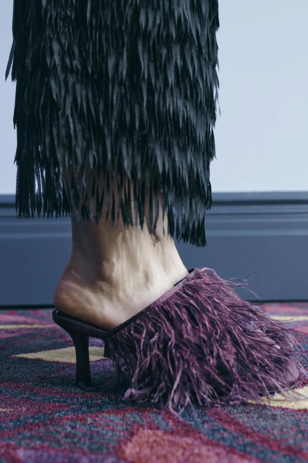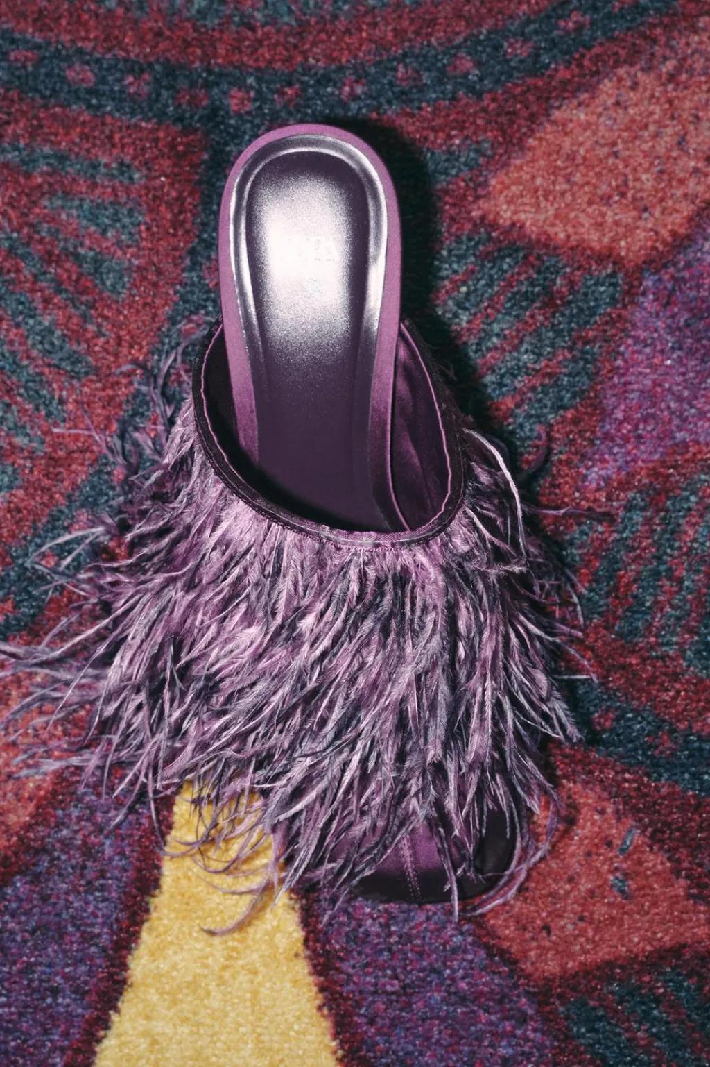 Zapato tipo destalonado con efecto satinado. Tacón fino. Detalle de plumas en la parte delantera. Acabado en punta redonda.