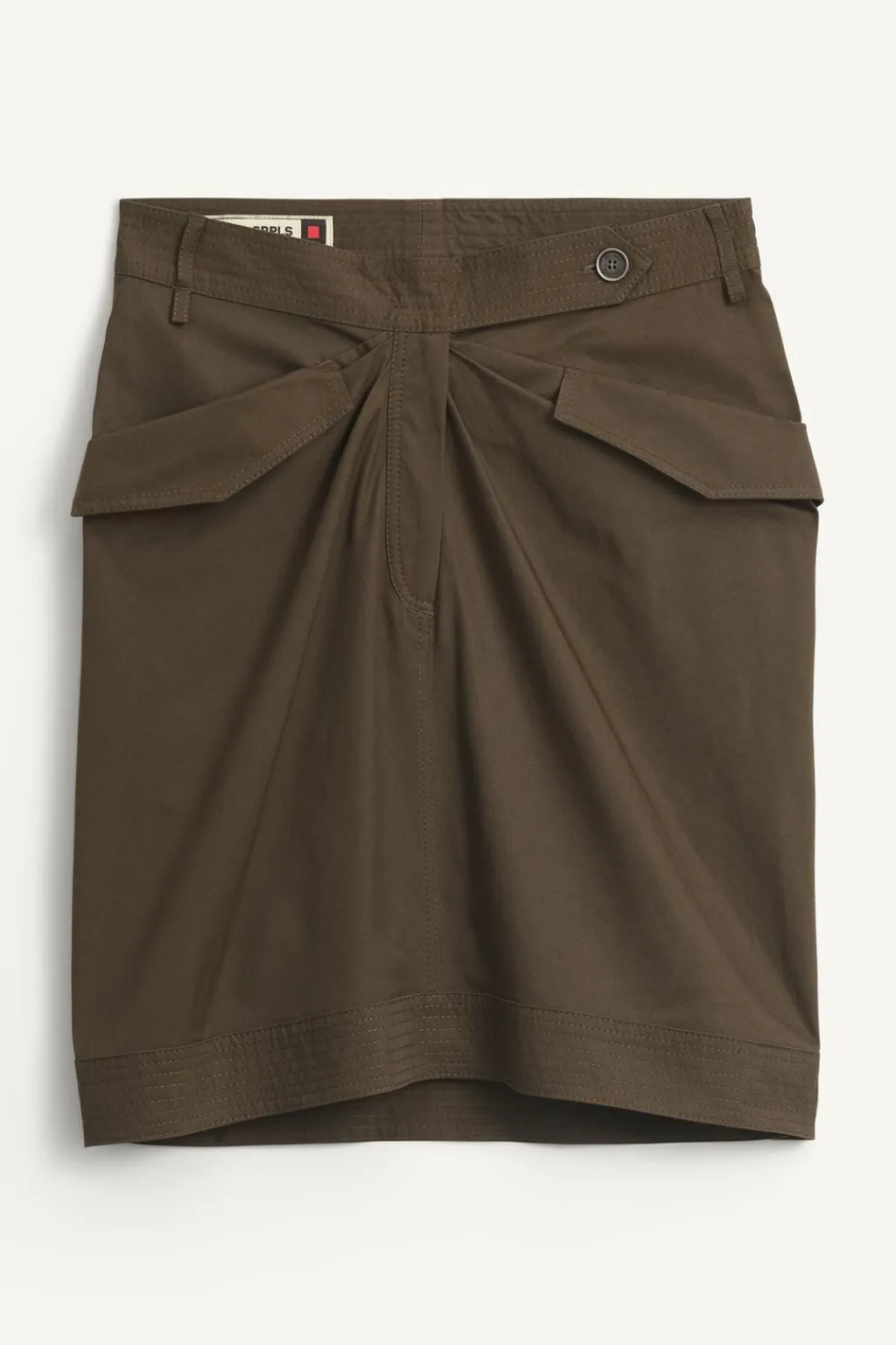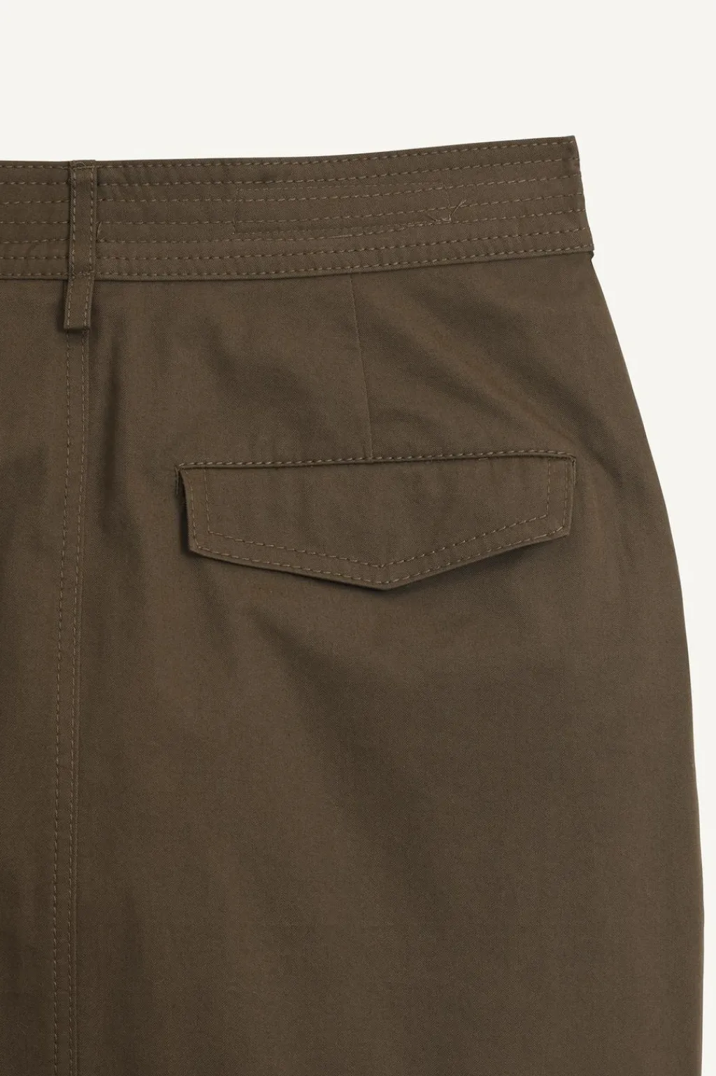 Falda por encima de la rodilla confeccionada en hilatura de algodón. Tiro medio y cintura con trabillas. Bolsillos en delantero y espalda. Detalle de pespuntes marcados a tono y pliegues en delantero. Cierre frontal con cremallera y botón.