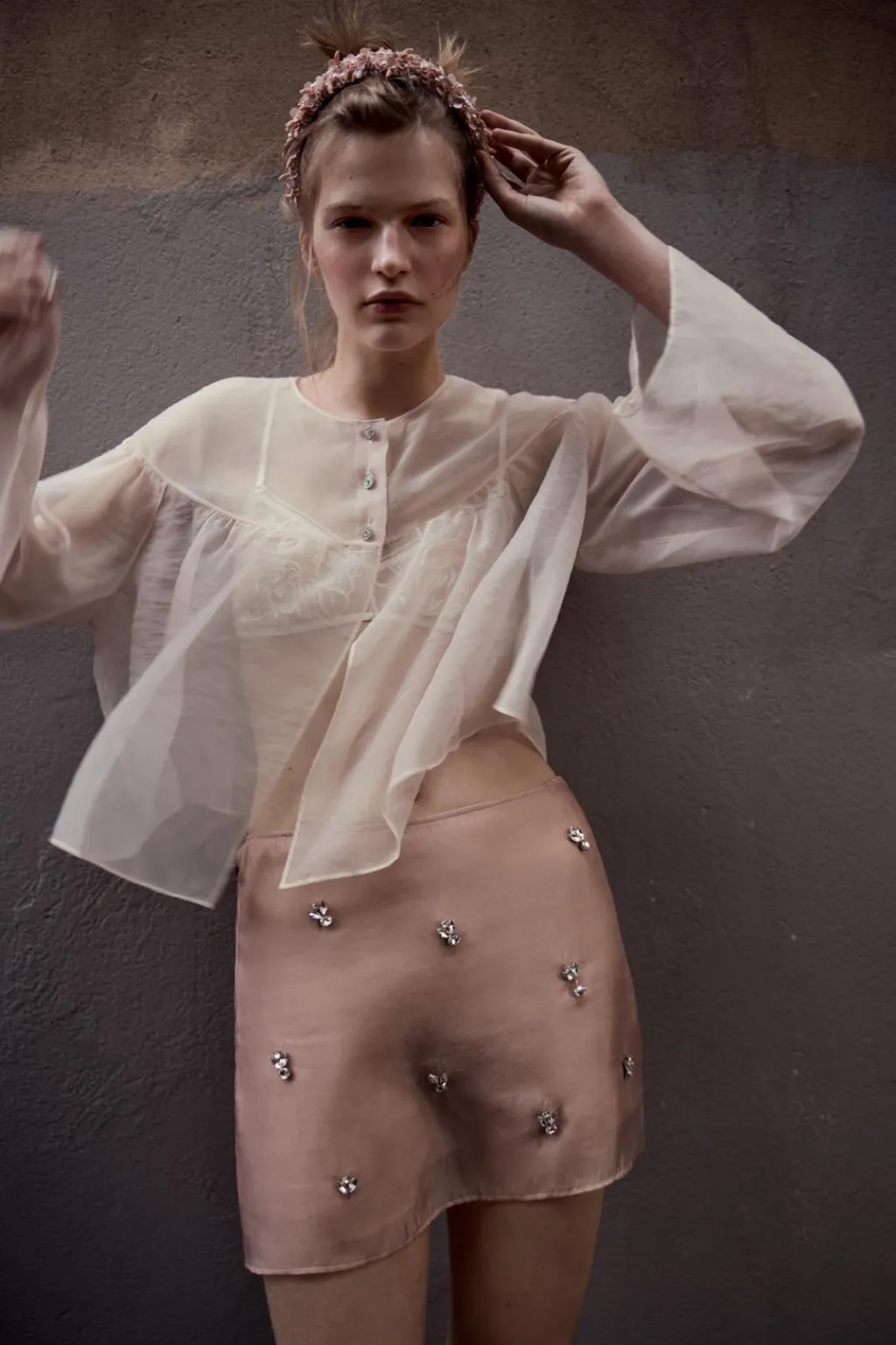 Falda corta de tiro medio confeccionada en hilatura con mezcla de viscosa. Detalle aplicación de joyas combinadas a contraste. Forro interior. Cierre lateral con cremallera oculta en costura.