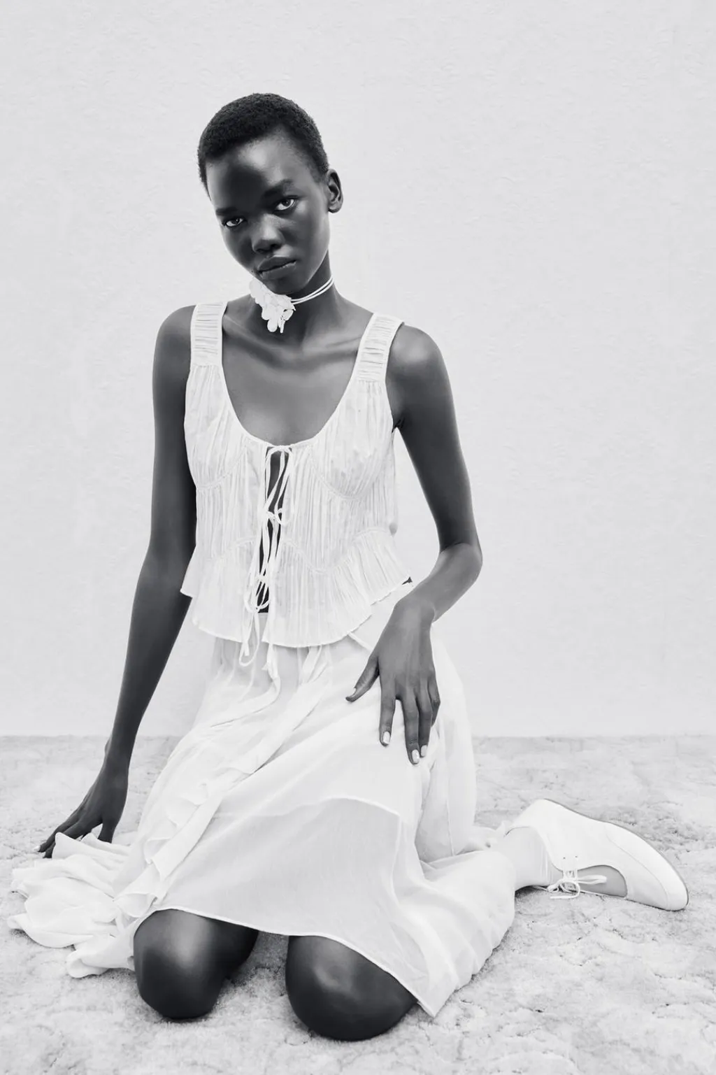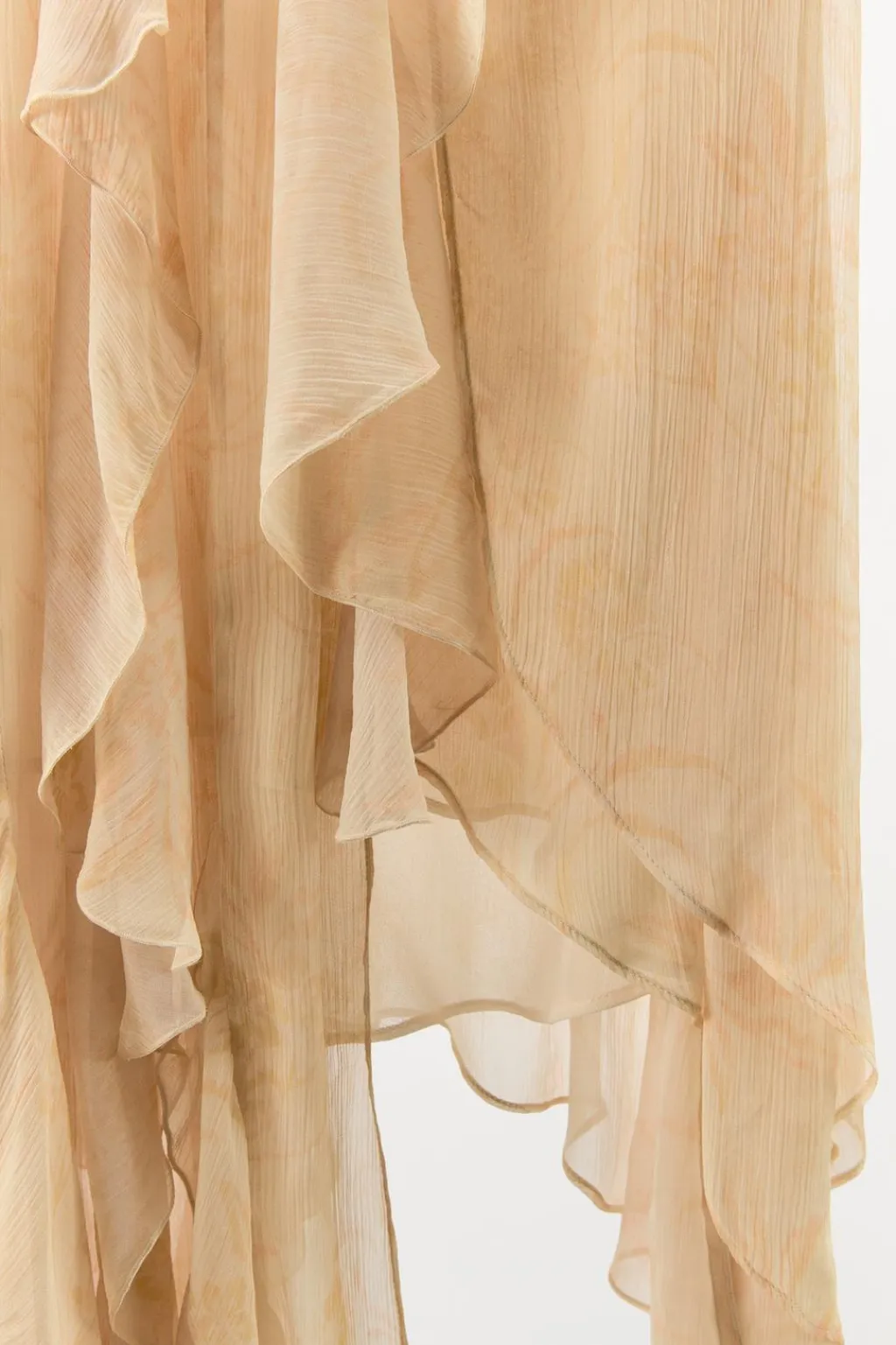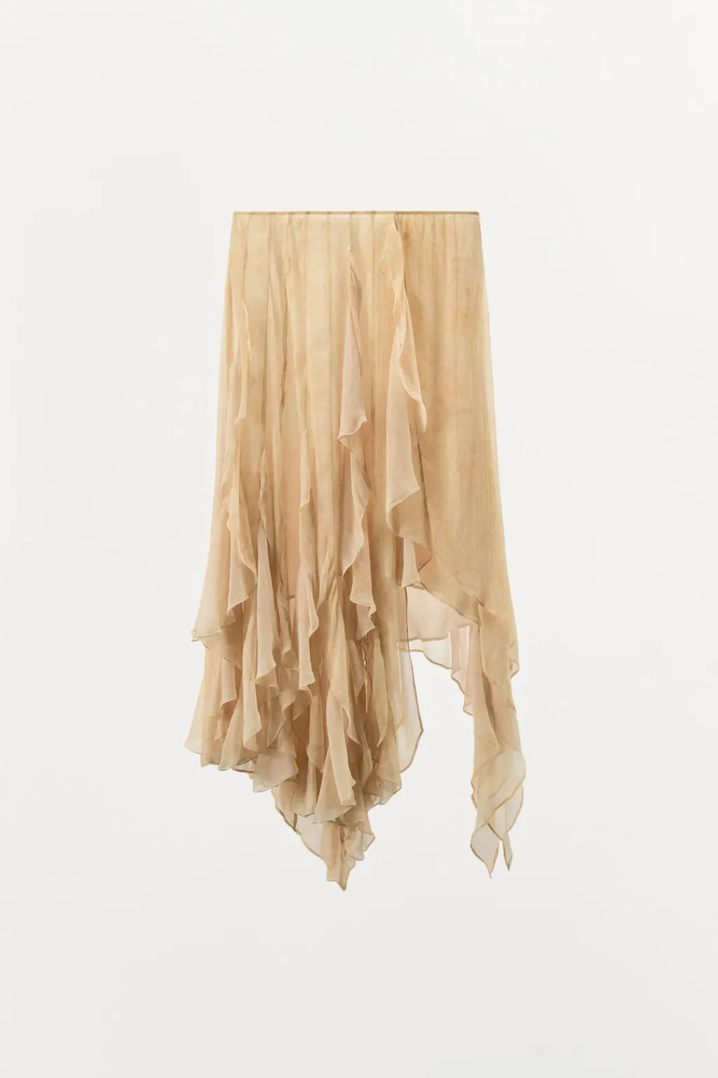 Falda midi de tiro medio confeccionada en hilatura de viscosa 100%. Detalle de volantes combinados a tono. Cierre lateral con cremallera oculta en costura. Bajo asimétrico. Forro interior.
