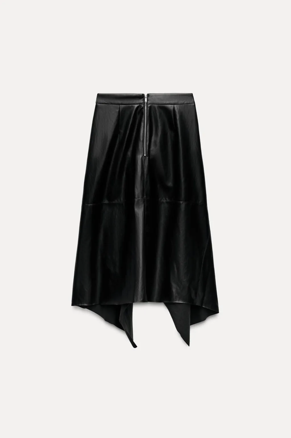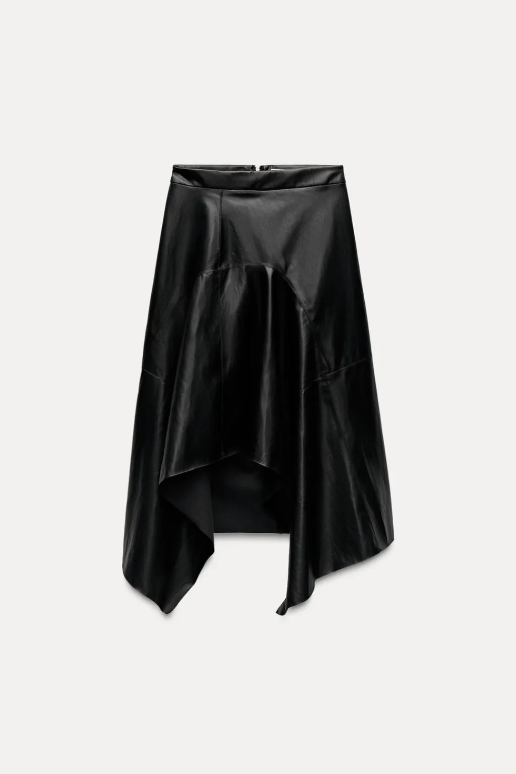Falda midi de tiro medio realizada en tejido efecto piel. Bajo asimétrico acabado en línea evasé. Cierre en espalda con cremallera metálica.