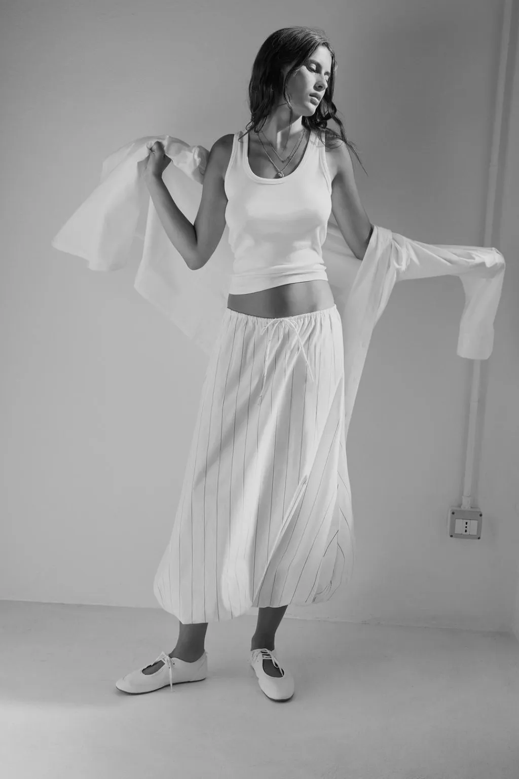 Falda midi de tiro medio con cintura elástica ajustable con lazada. Bolsillos laterales ocultos en costura. Forro interior cominado. Bajo acabado globo con elástico interior.