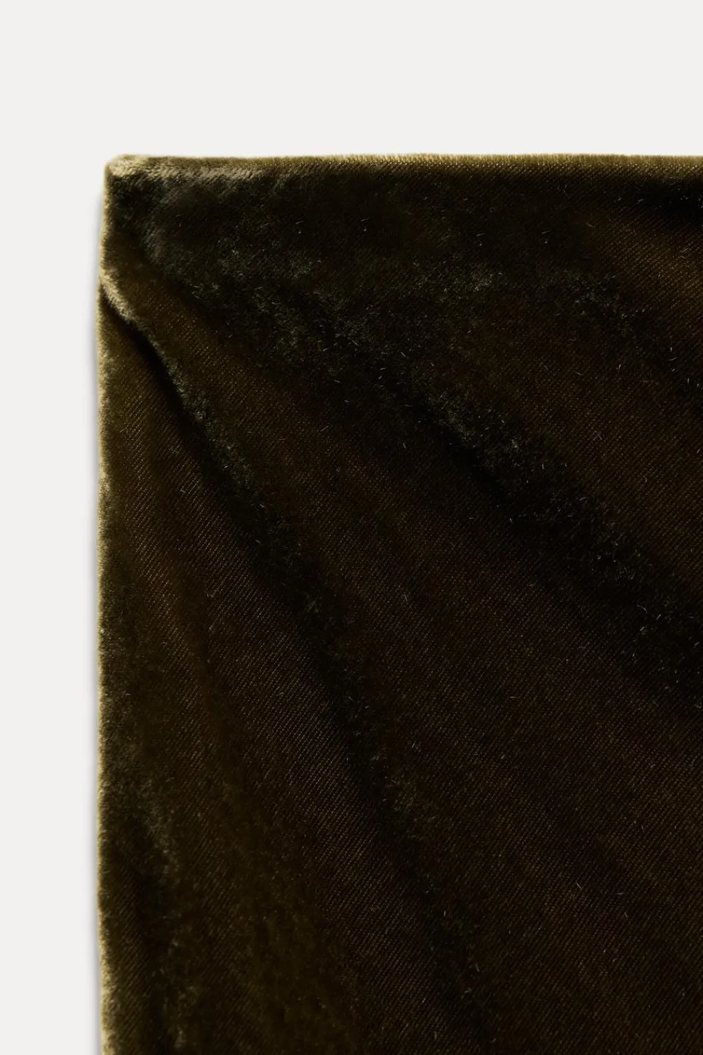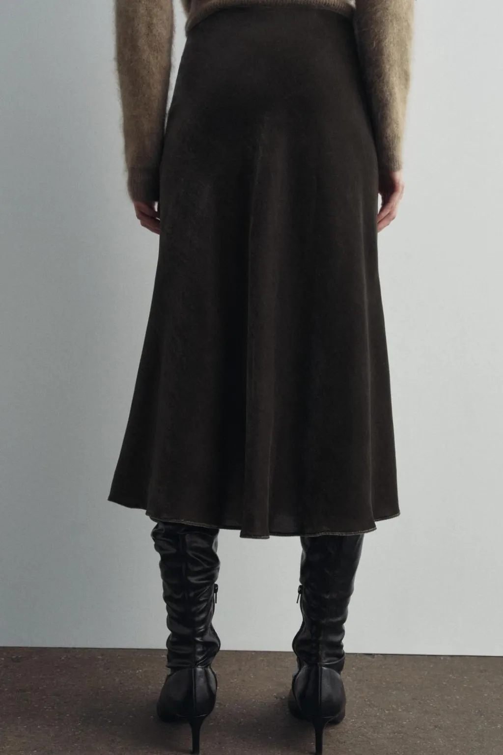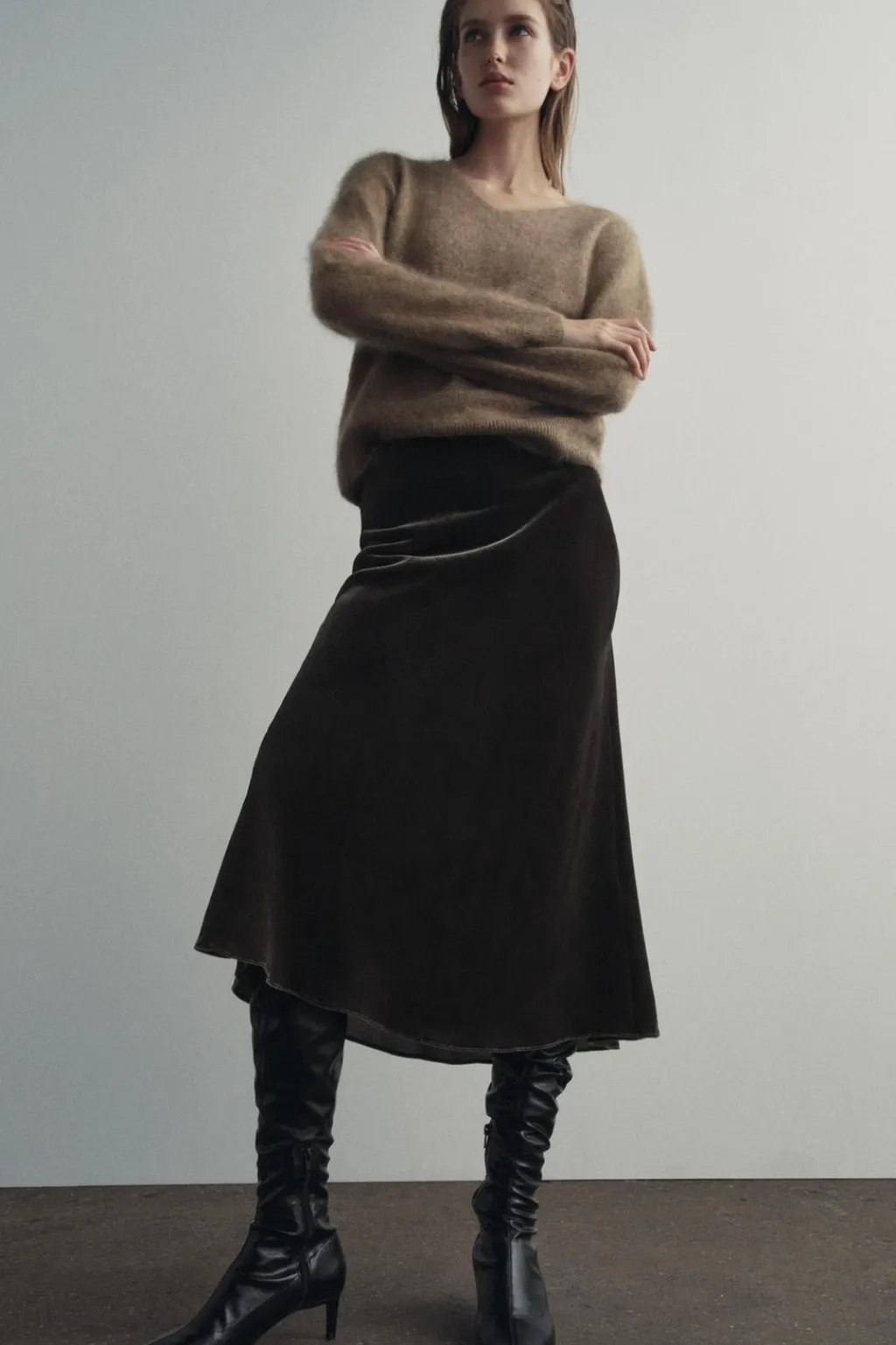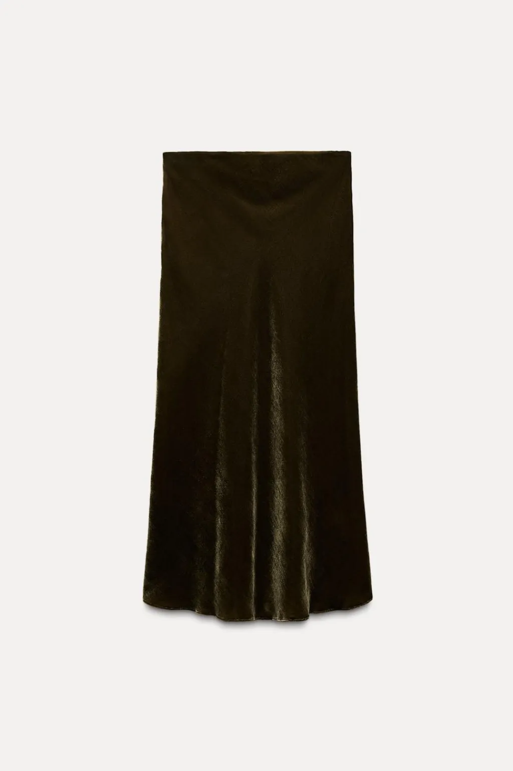 Falda midi de tiro medio confeccionada en tejido de terciopelo. Bajo acabado en línea evasé. Cierre con cremallera oculta en costura.