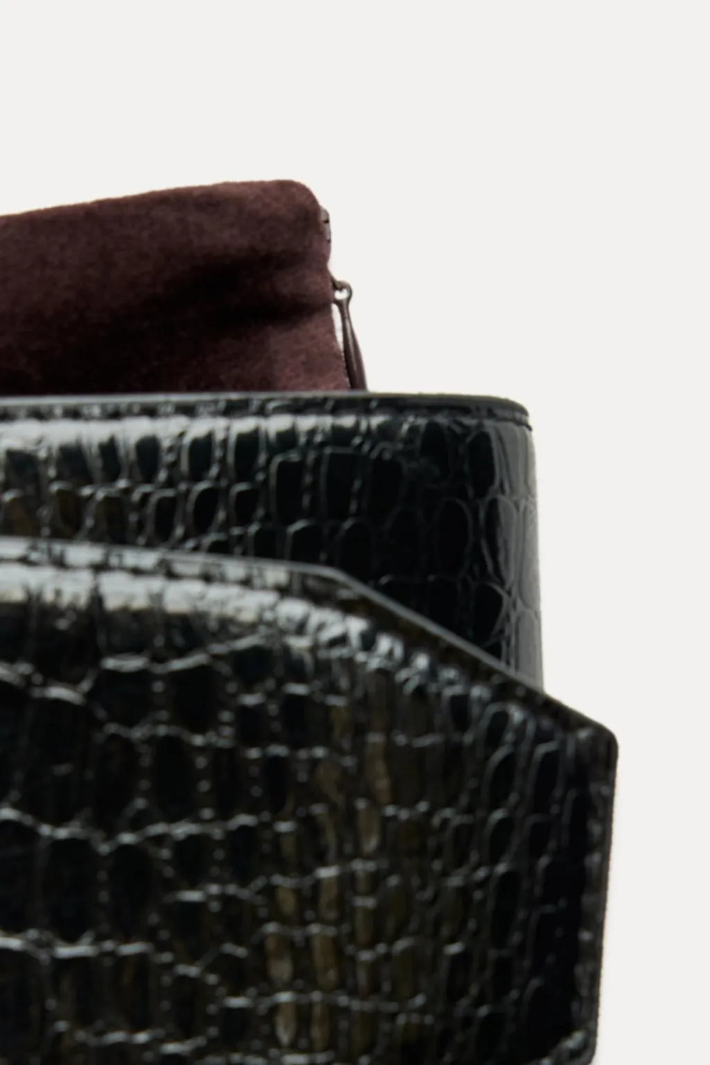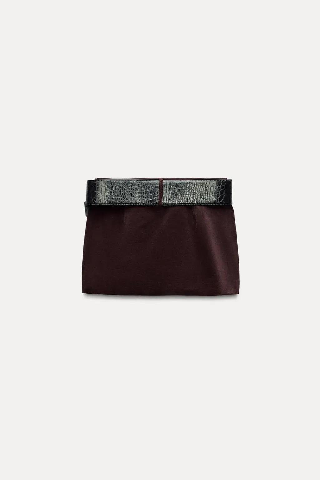 Falda mini de tiro bajo. Cinturón ancho combinado a contraste con hebilla metálica. Forro interior. Cierre lateral con cremallera oculta en costura.