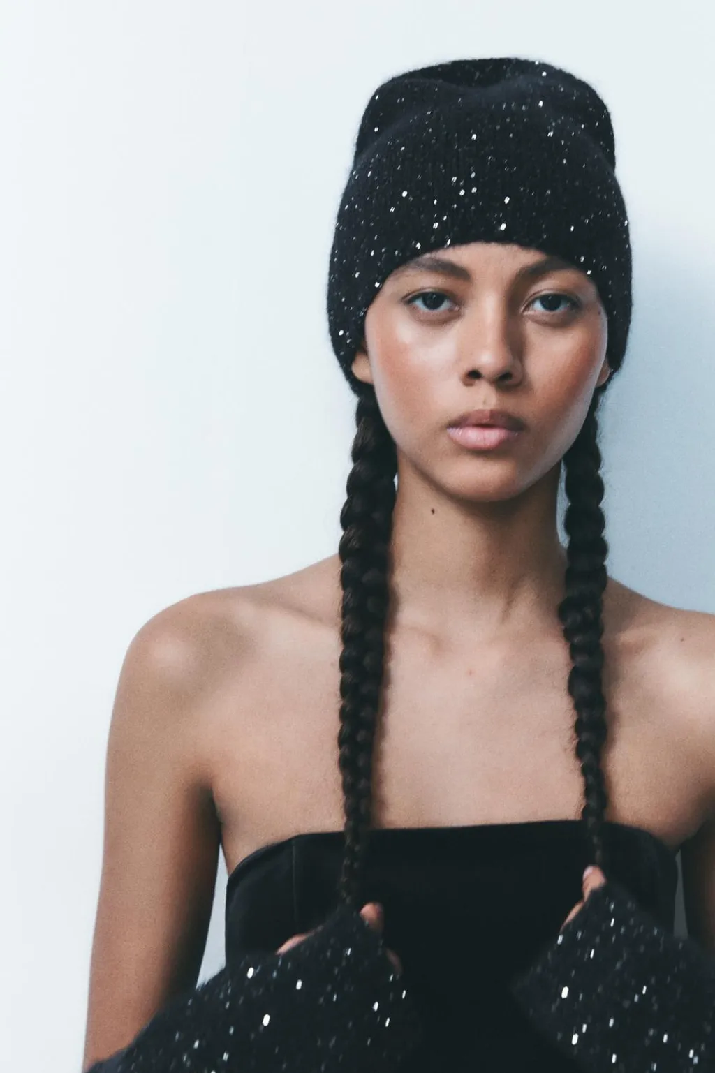 Gorro beanie confeccionado con 4% de lana. Detalle aplicación lentejuelas.