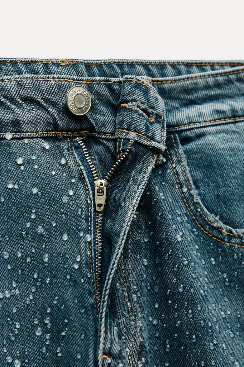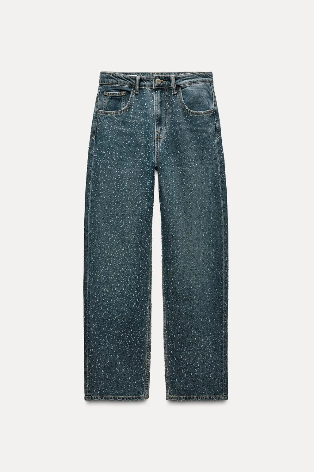 Jeans de tiro alto con cinco bolsillos. Efecto lavado. Detalle de strass. Cierre frontal con cremallera y botón.