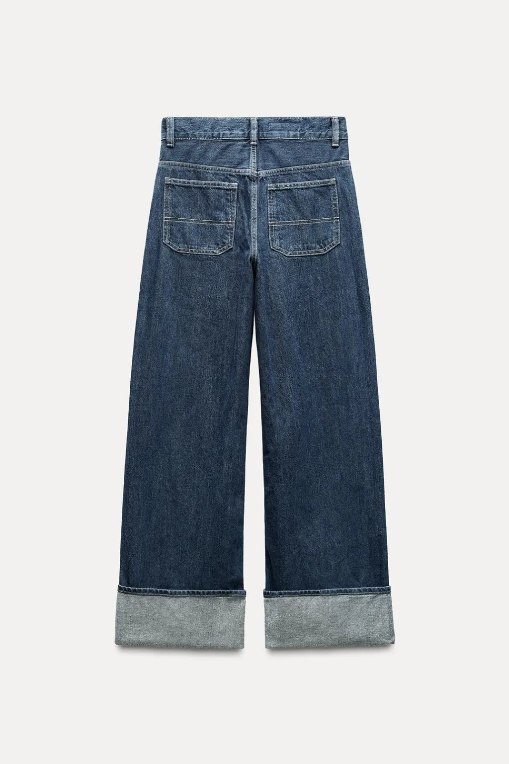 Jeans de tiro alto y cinco bolsillos. Pierna ancha extra larga. Cierre con cremallera y botón metálico.