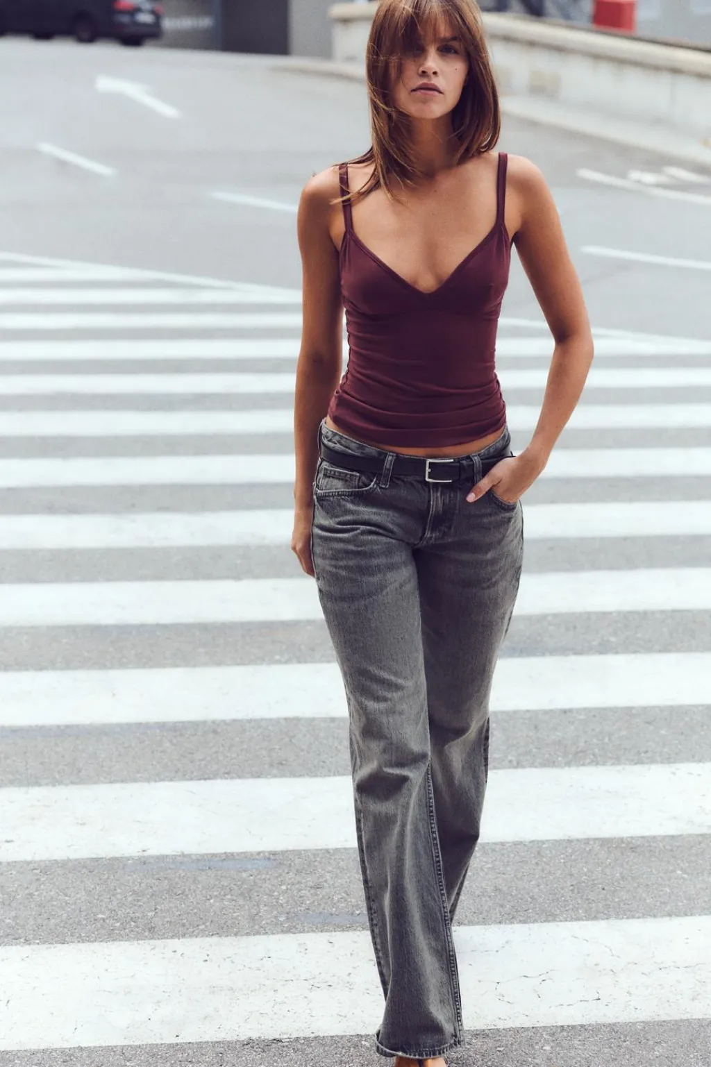 Jeans de tiro bajo con trabillas y cinco bolsillos. Cierre frontal con cremallera y botón metálico.