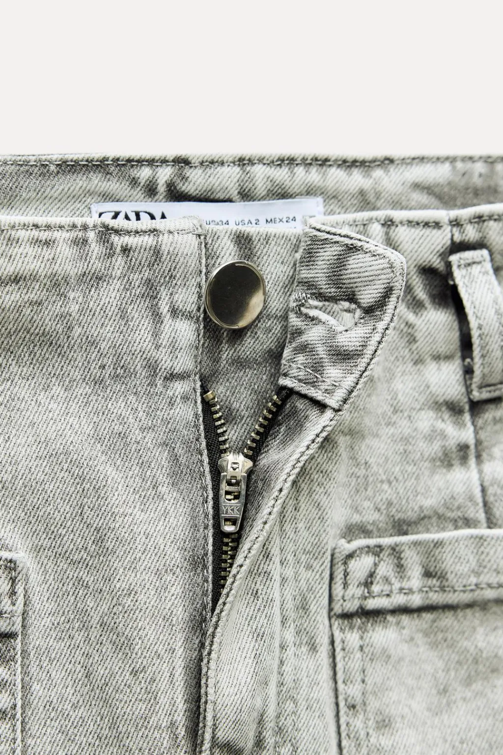 Jeans de tiro alto con cinturón. Bolsillos delanteros de plastrón y falsos bolsillos de vivo en espalda. Pernera ancha y corta. Cierre frontal con cremallera y botón.