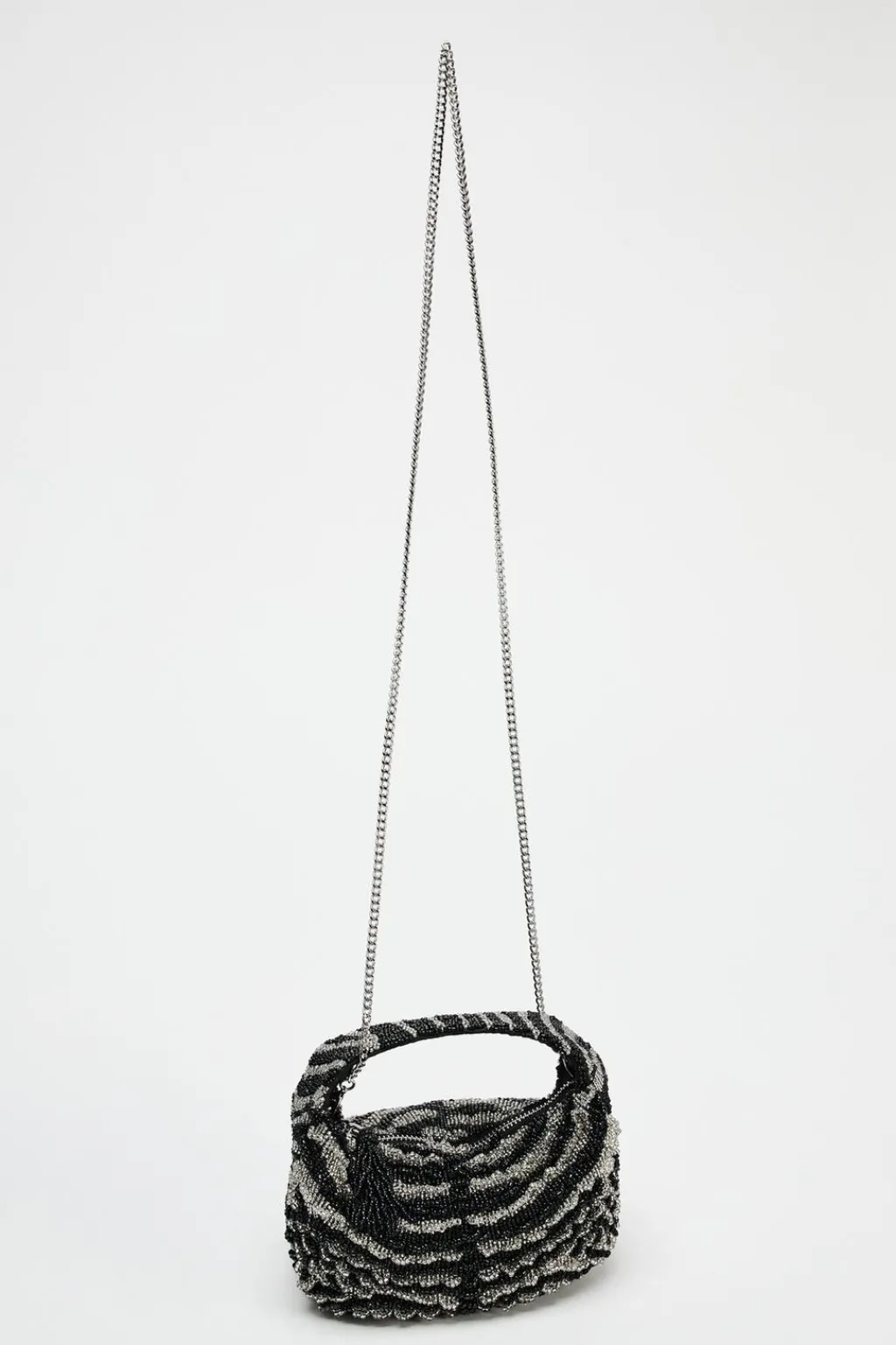 Bolso formato mini con detalle de lentejuelas en el cuerpo. Asa de mano y asa bandolera en cadena. Forro interior con bolsillo y cierre mediante cremallera con tirador.