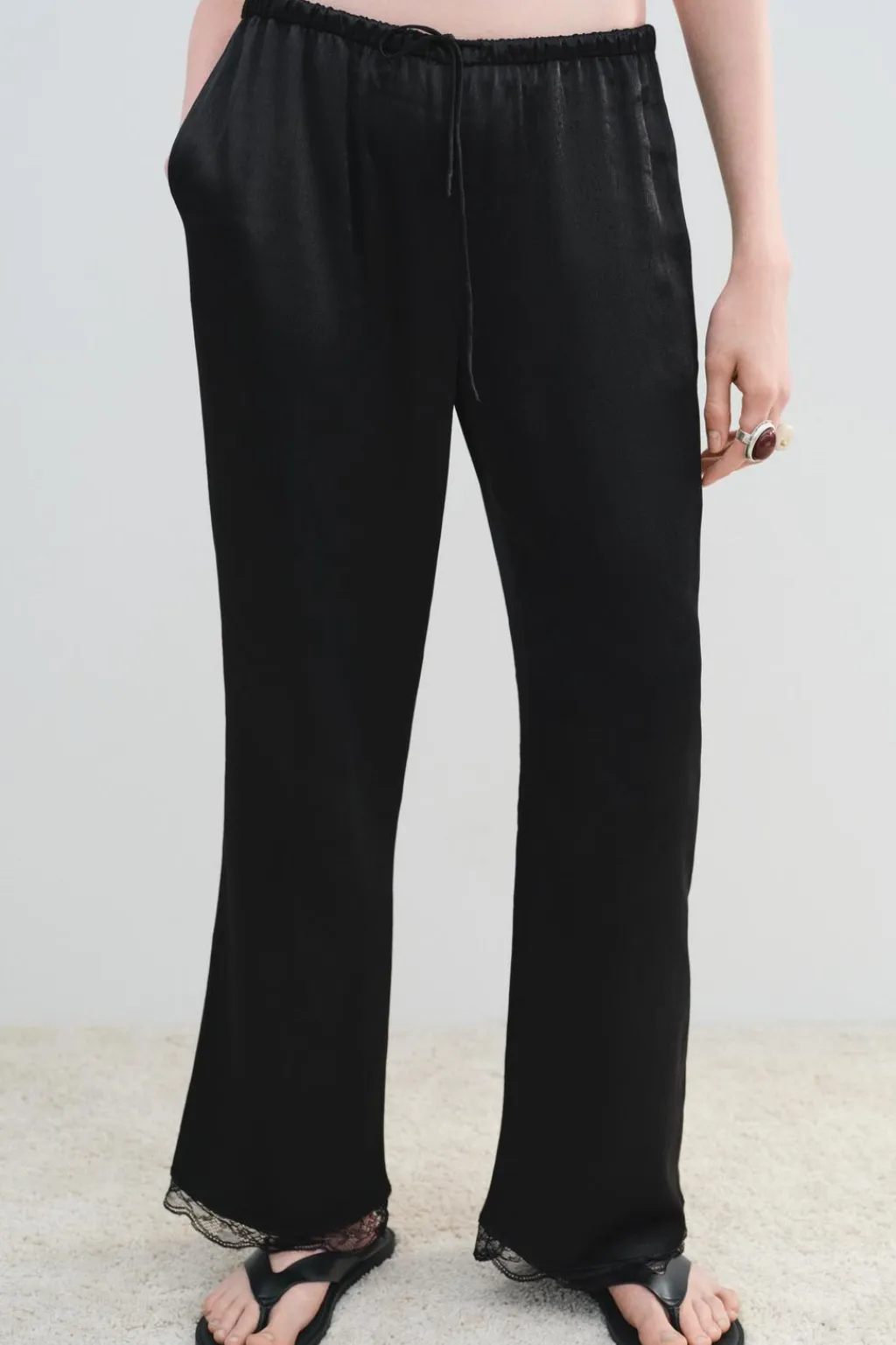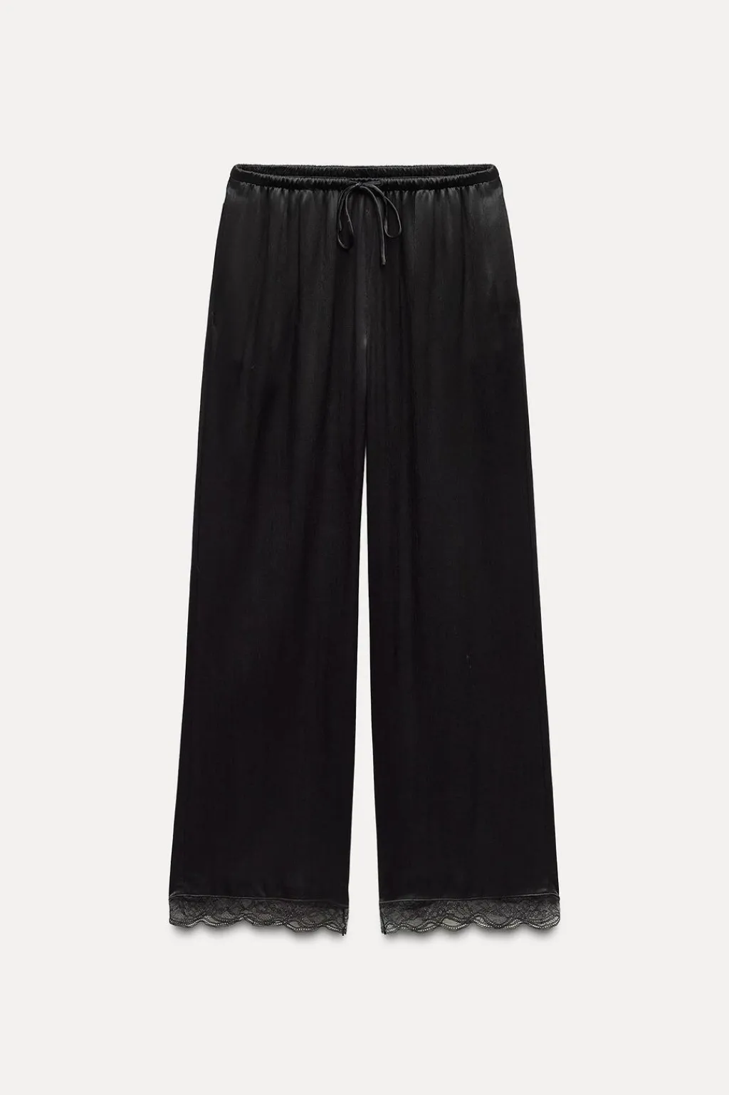 Pantalón confeccionado en hilatura de viscosa 100%. Tiro medio y cintura elástica ajustable con cordones. Pierna recta. Bajo acabado en puntilla a tono.