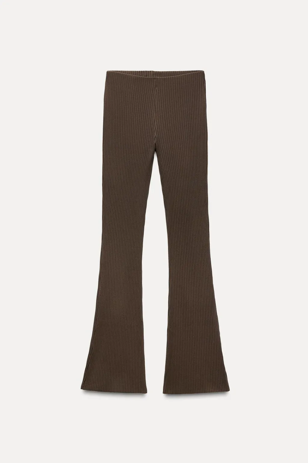 Pantalón confeccionado en canalé de tiro alto con cintura elástica. Bajo acabado flare.