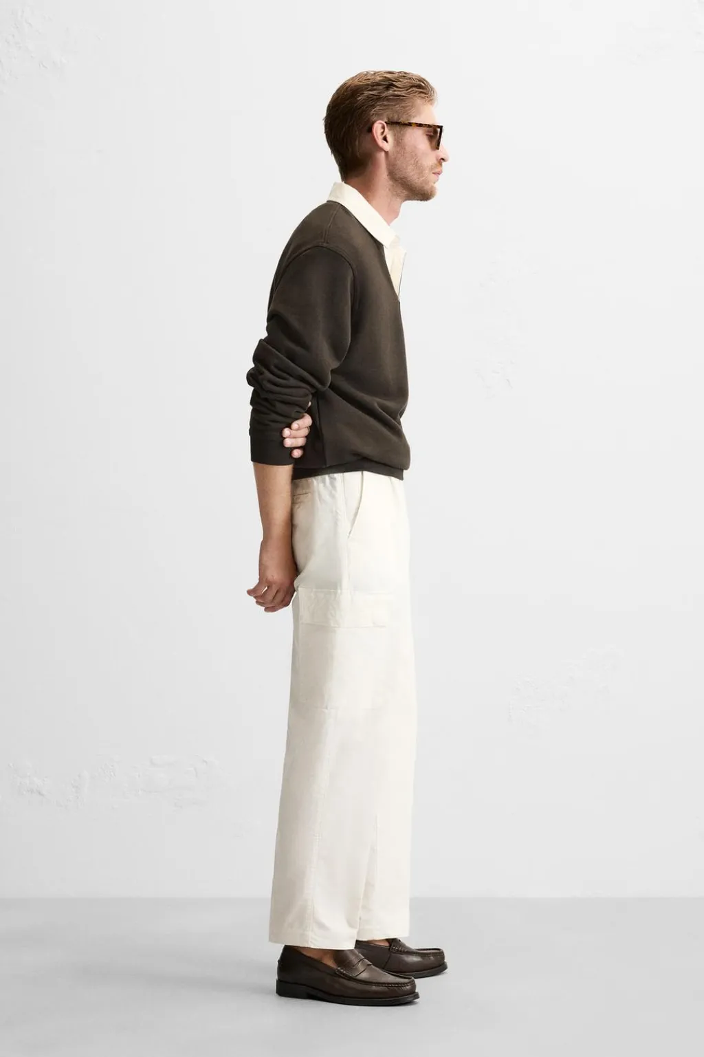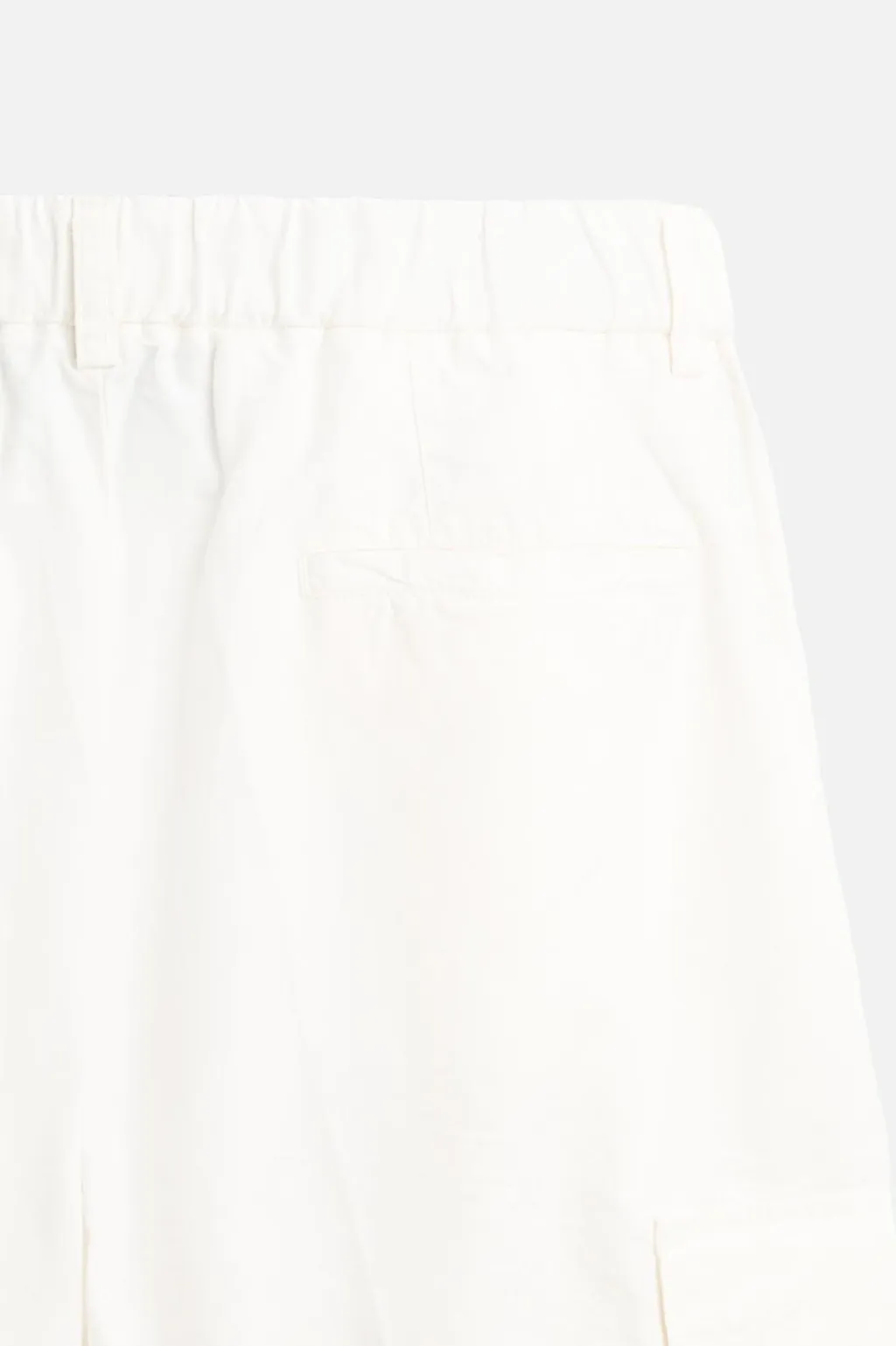 Pantalón slim fit confeccionado en tejido con mezcla de algodón, lino y 17% de lyocell. Cintura elástica con pliegues en delantero. Bolsillos frontales y detalle de bolsillos traseros de vivo. Aplicación de bolsillos plastrón con solapa en perneras. Efecto lavado. Cierre frontal con cremallera y botón.