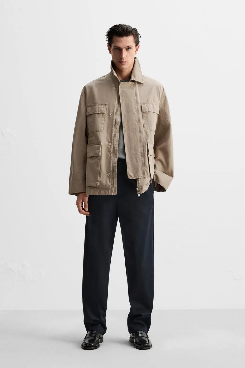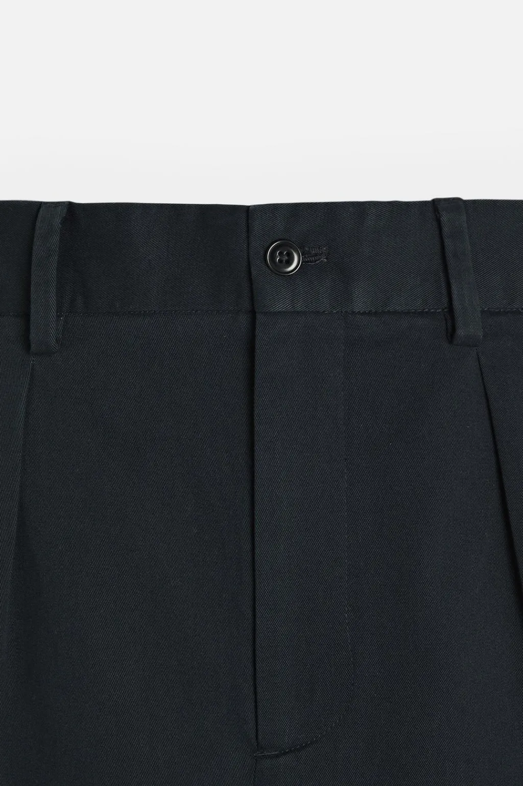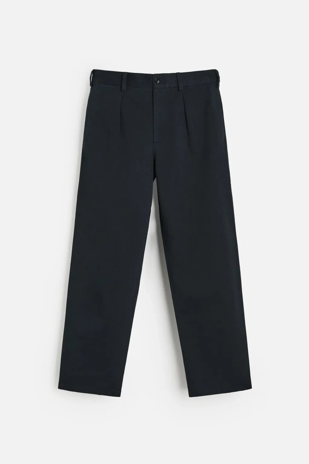 Pantalón regular fit confeccionado en tejido de algodón con estructura diagonal. Cintura con detalle de pliegues frontales. Bolsillos en delantero y detalle de bolsillos traseros de doble vivo con botón. Cierre frontal con cremallera y botón.