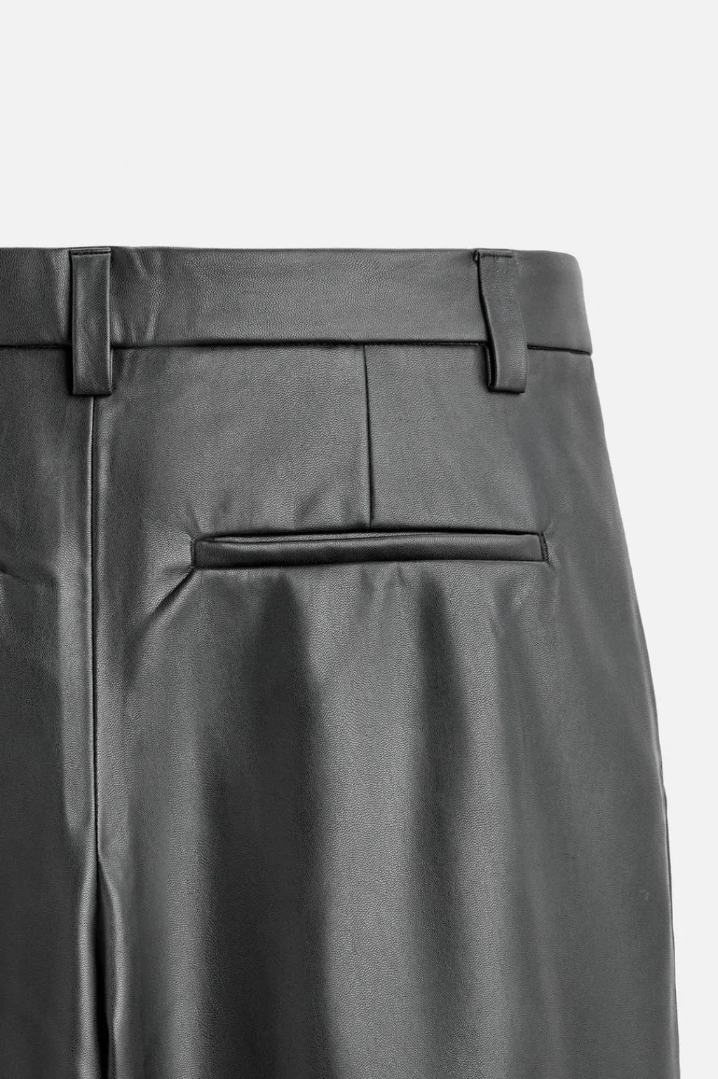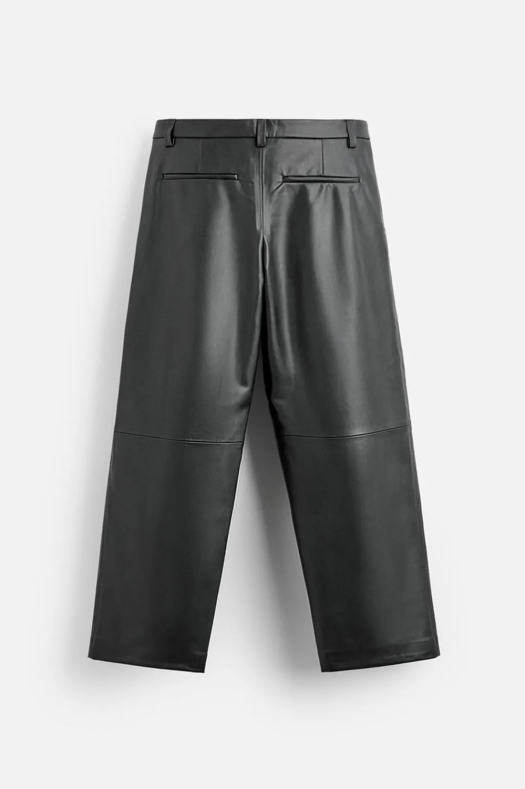 Pantalón straight fit confeccionado en tejido efecto piel. Cintura con detalle de pliegues en delantero. Bolsillos frontales y detalle de bolsillos traseros de vivo. Cierre frontal con cremallera y botón.