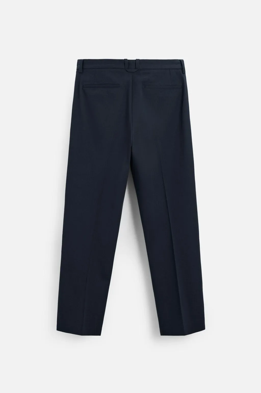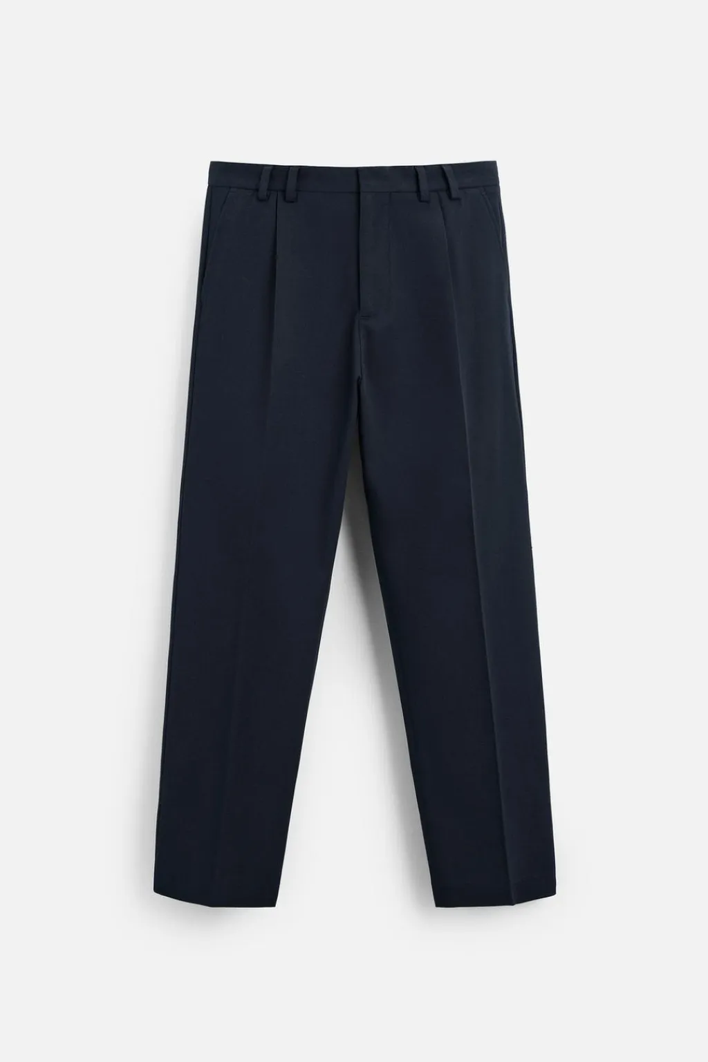 Pantalón straight fit confeccionado en tejido con mezcla de algodón. Cintura con detalle de pliegues en delantero. Bolsillos frontales y detalle de bolsillos traseros de vivo. Cierre frontal con cremallera y gancho metálico oculto.