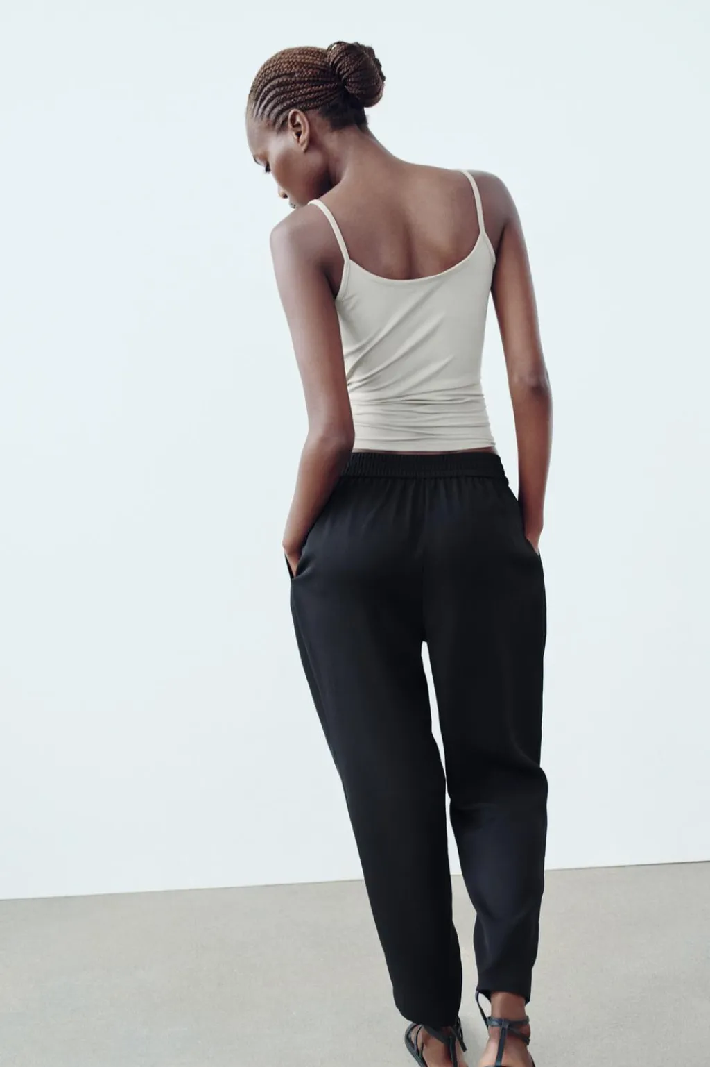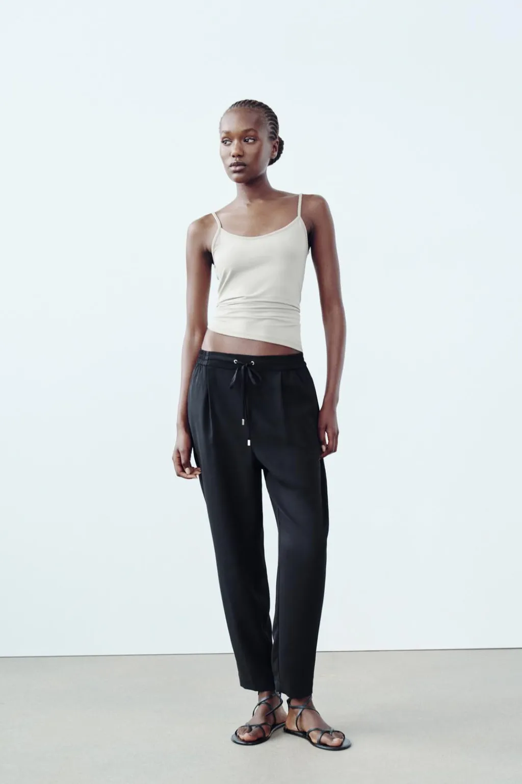 Pantalón de tiro alto con pinzas delanteras. Cintura elástica ajustable con cordón. Bolsillos laterales ocultos en costura.
