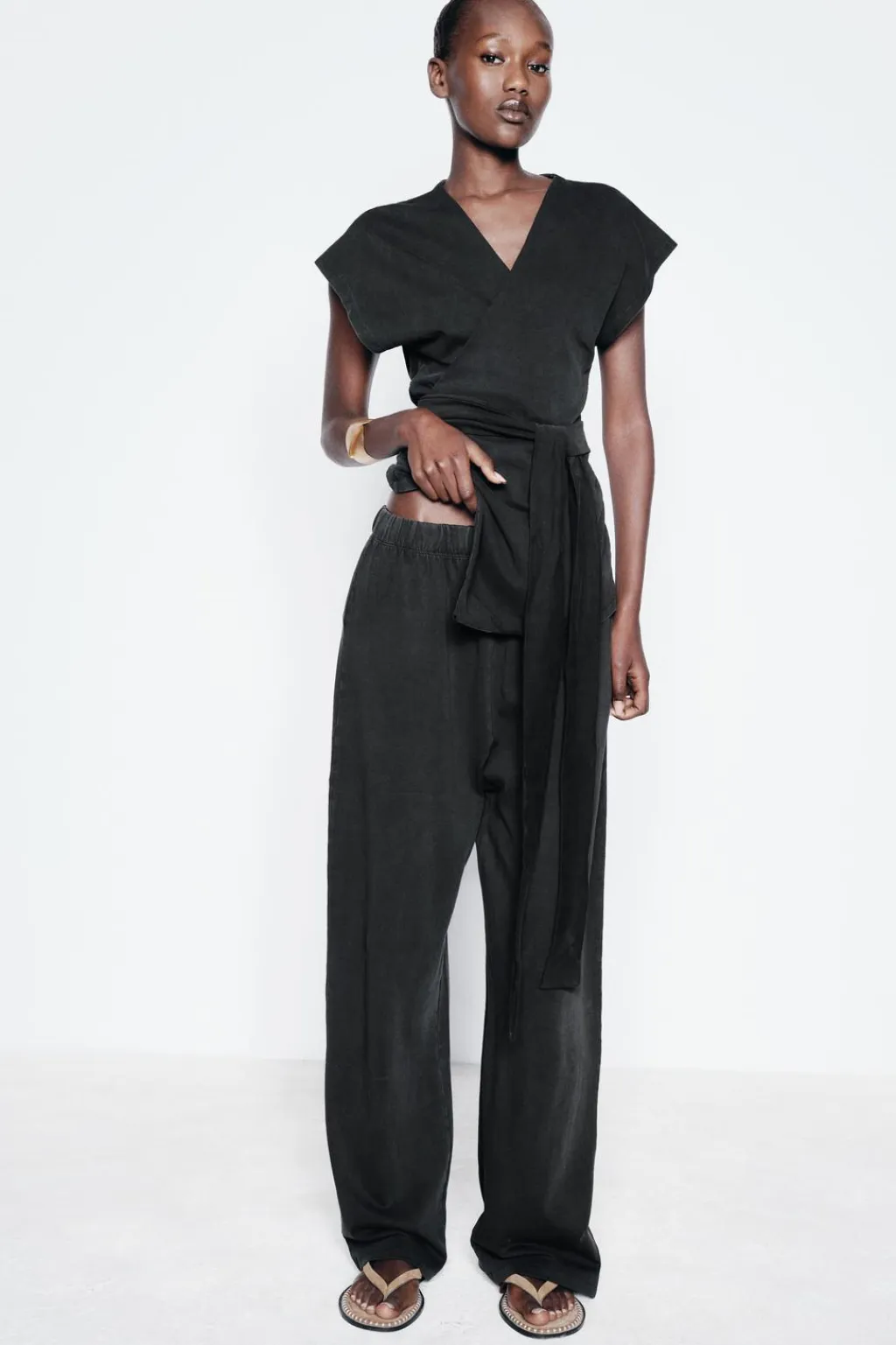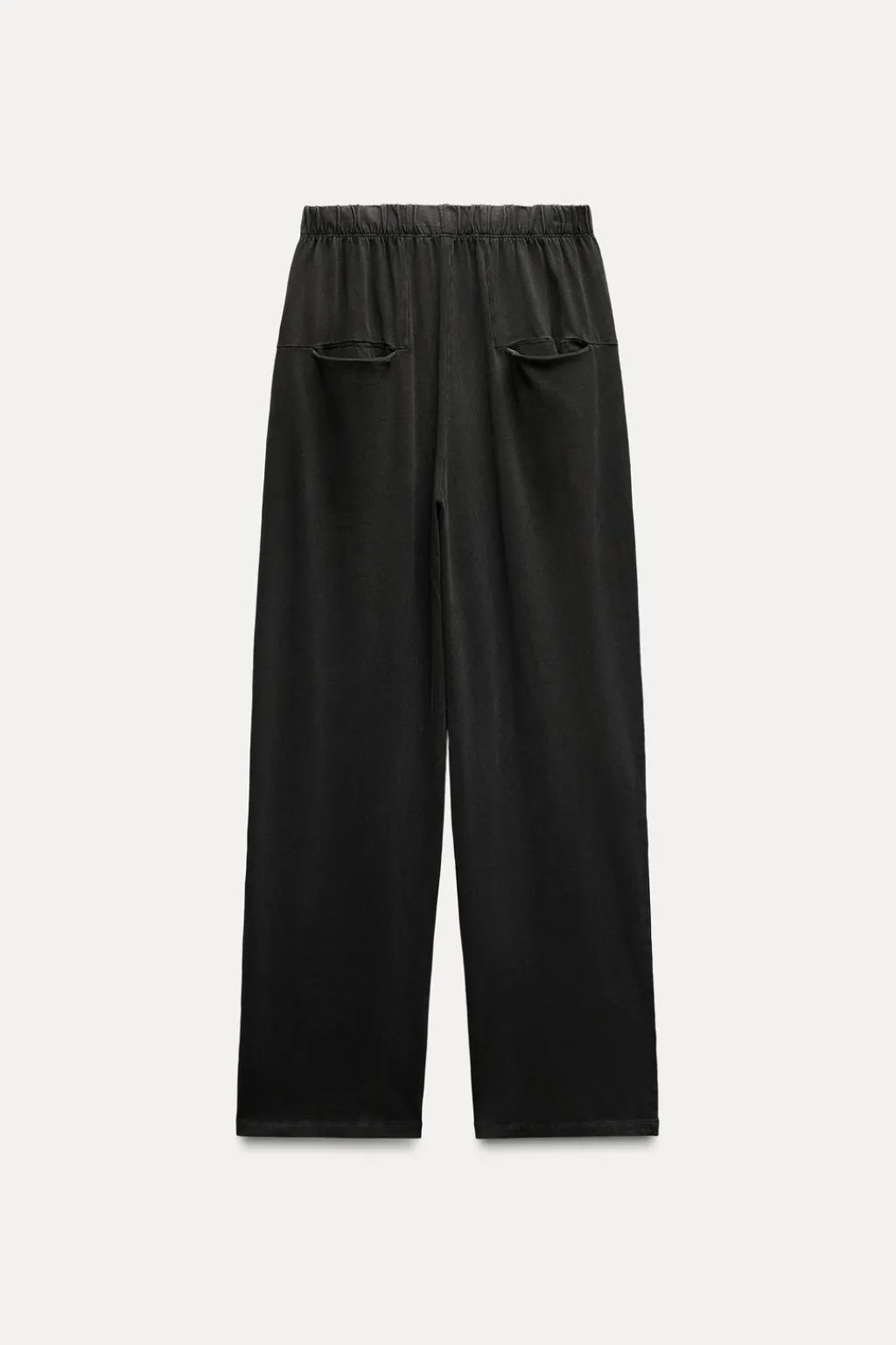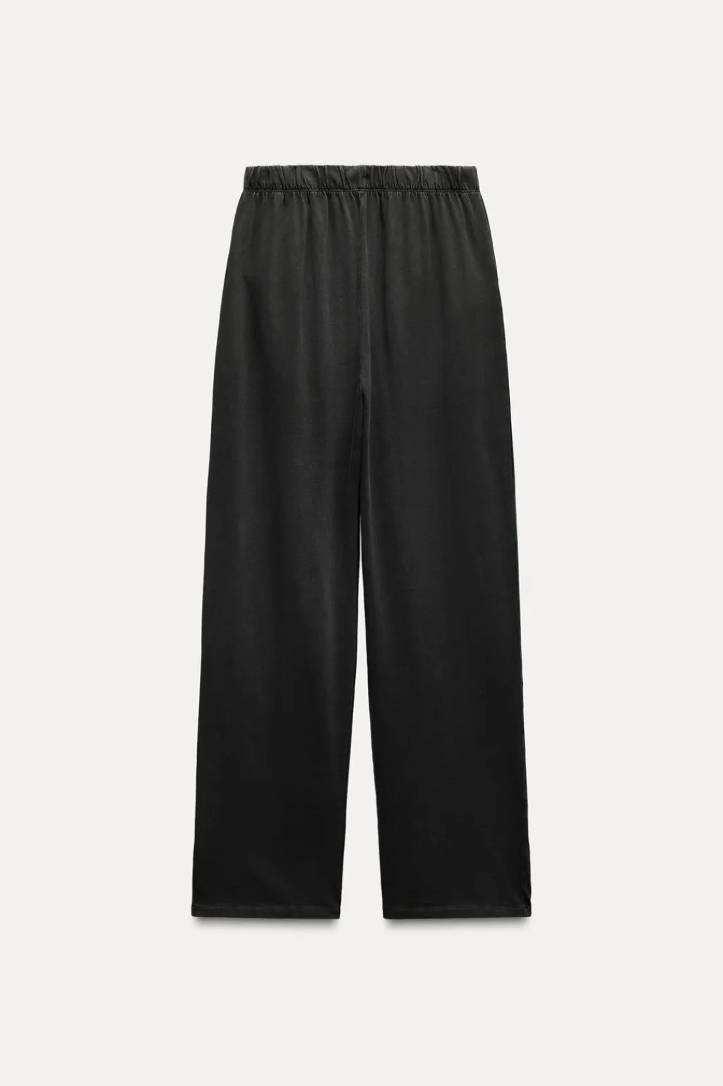 Pantalón confeccionado en hilatura de algodón compacto. Tiro medio y cintura con elástico. Pierna ancha.