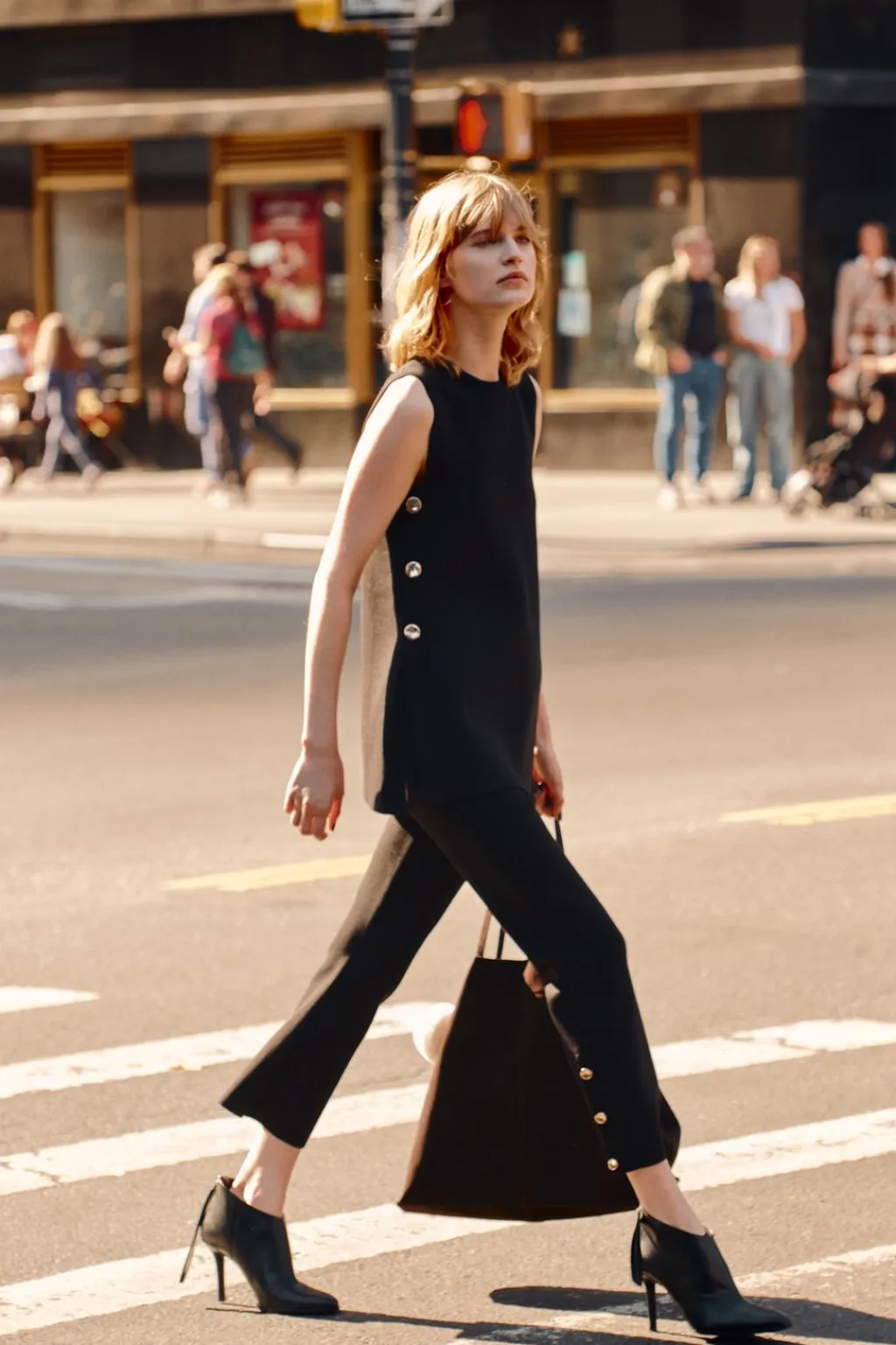Pantalón de tiro alto con cintura elástica. Pernera recta. Detalle de bajo acabado con botones dorados laterales.
