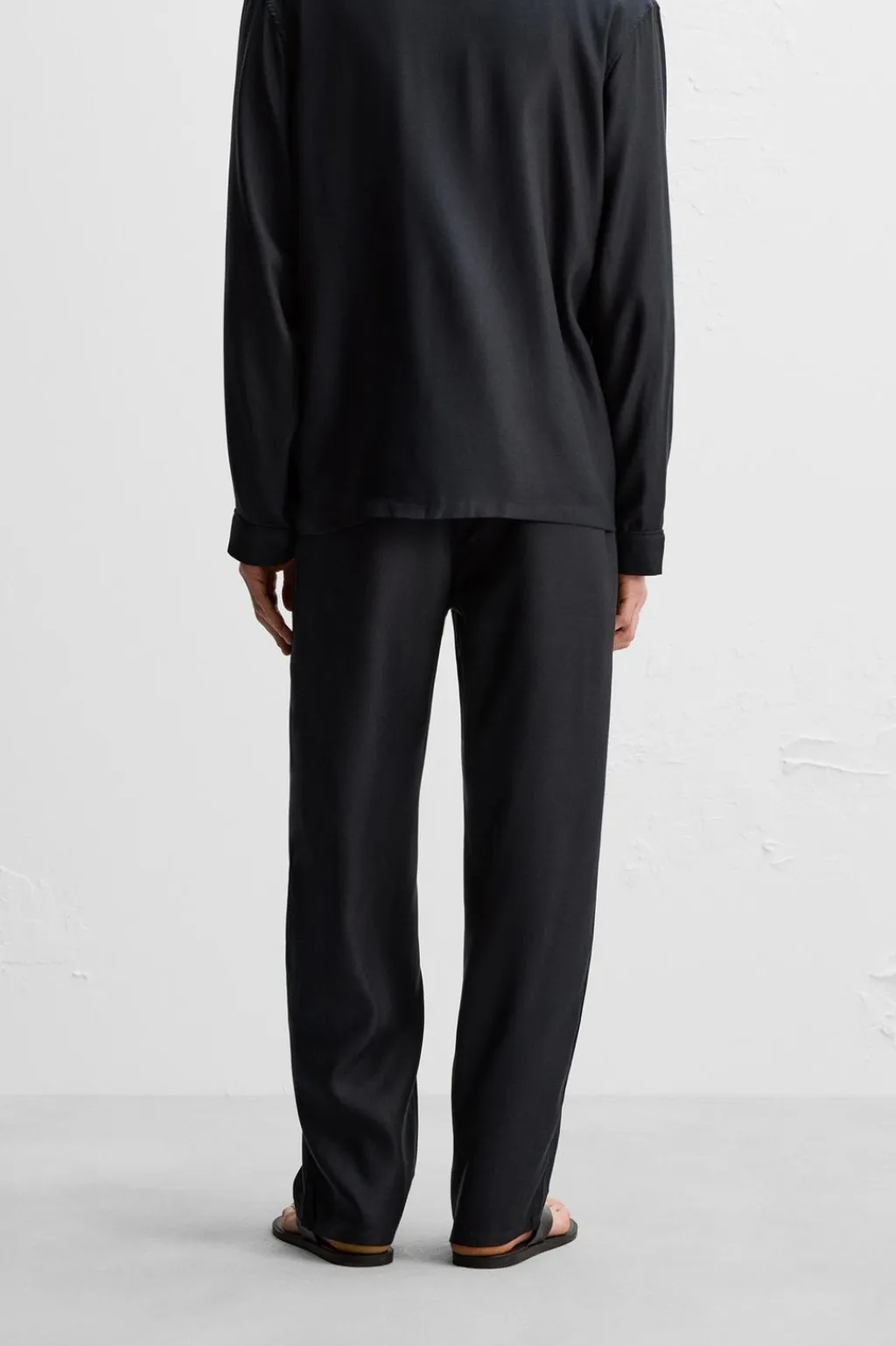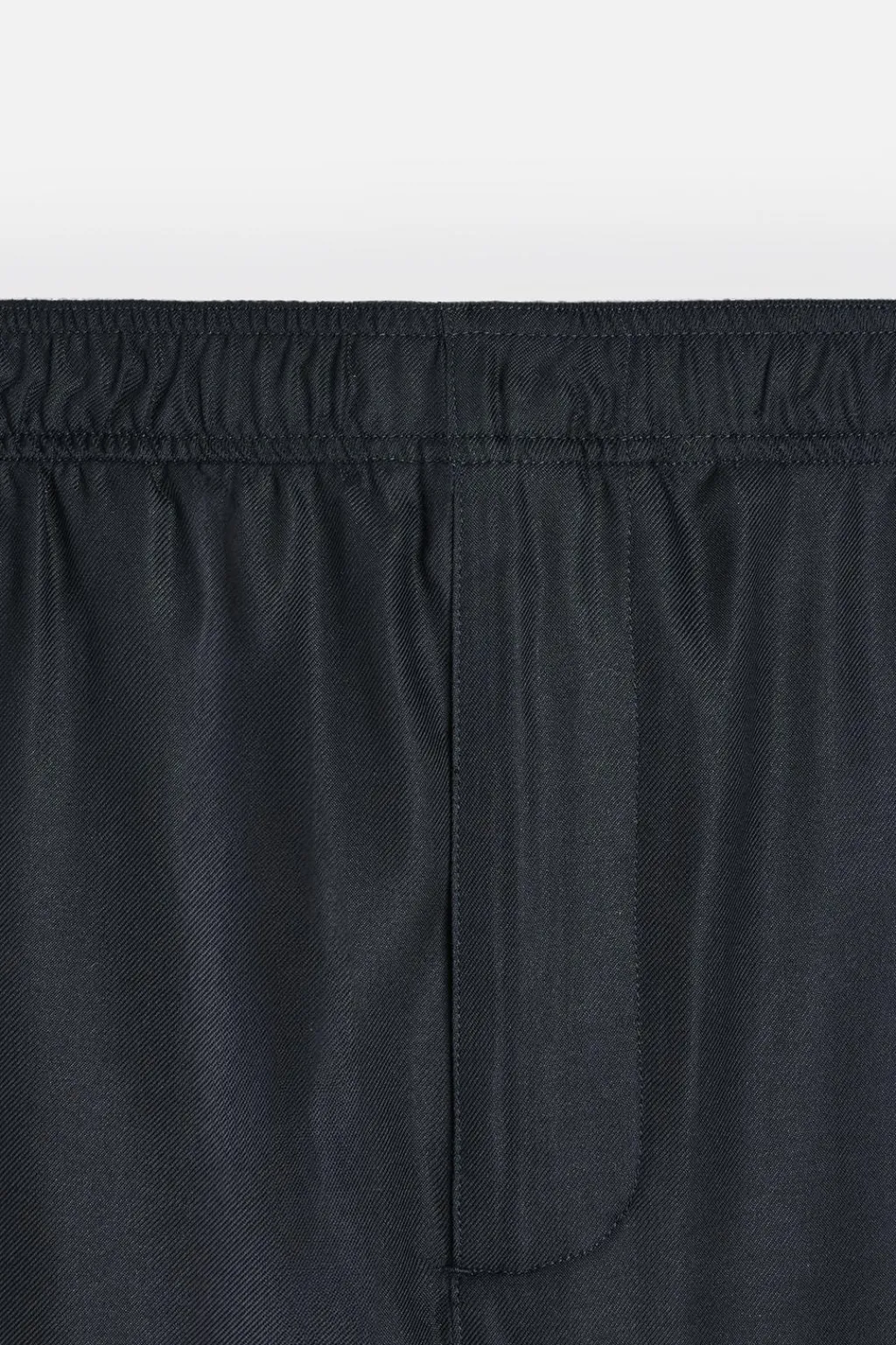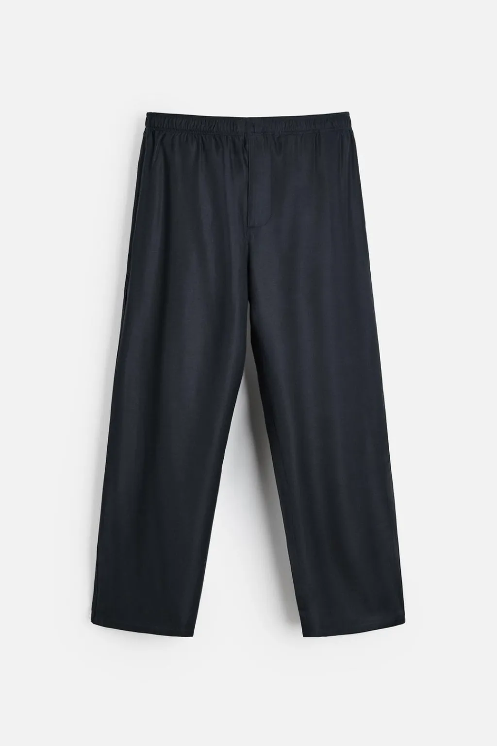 Pantalón relaxed fit confeccionado en tejido ligero de seda con estructura twill. Cintura elástica ajustable con cordón interior. Bolsillos laterales.