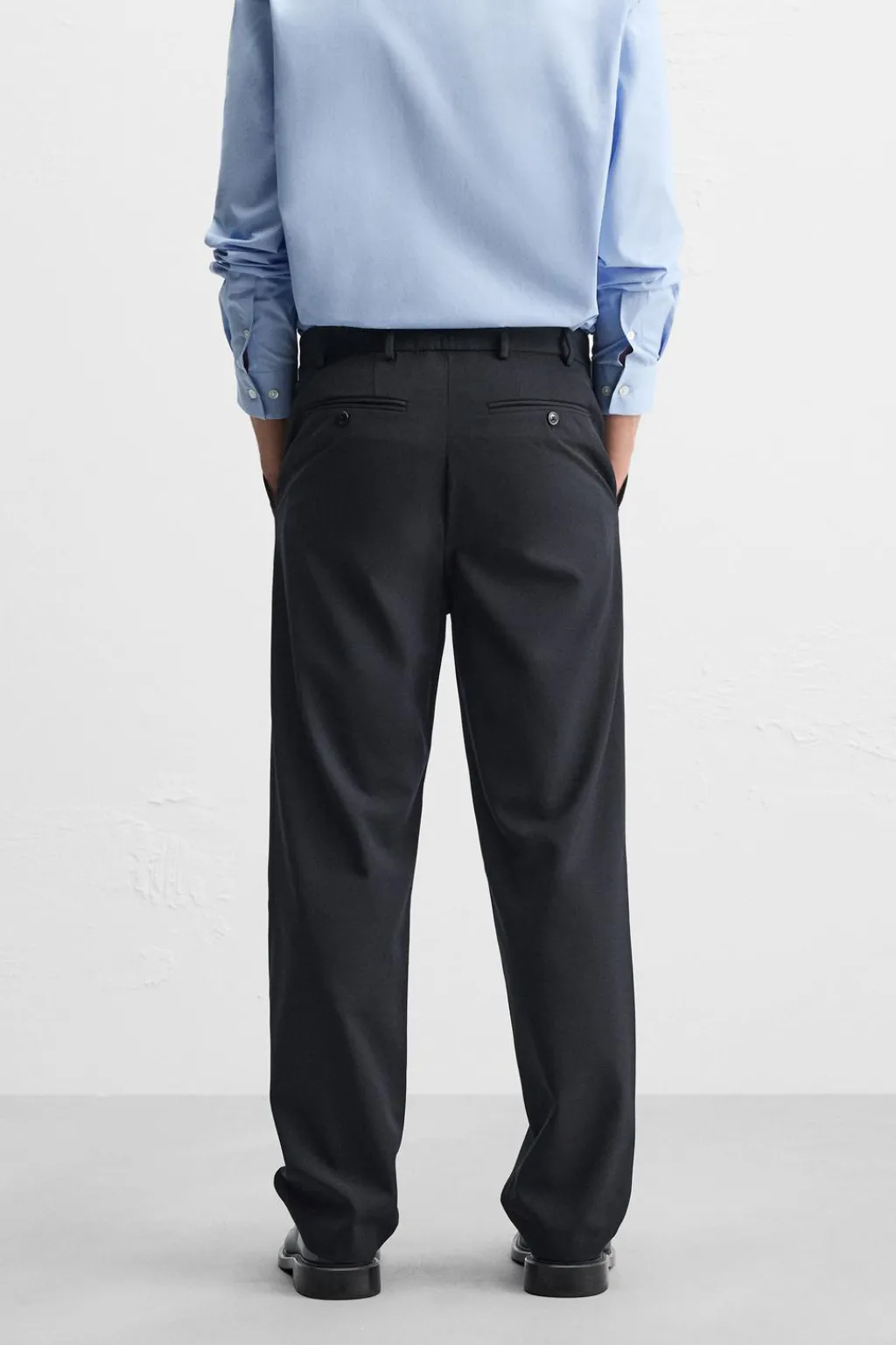 Bolsillos frontales y detalle de bolsillos traseros de doble vivo con botón. Cierre frontal con cremallera y botón.