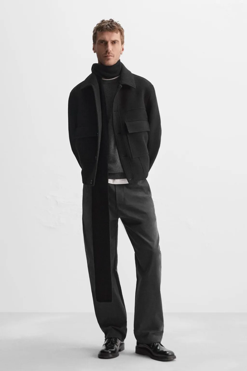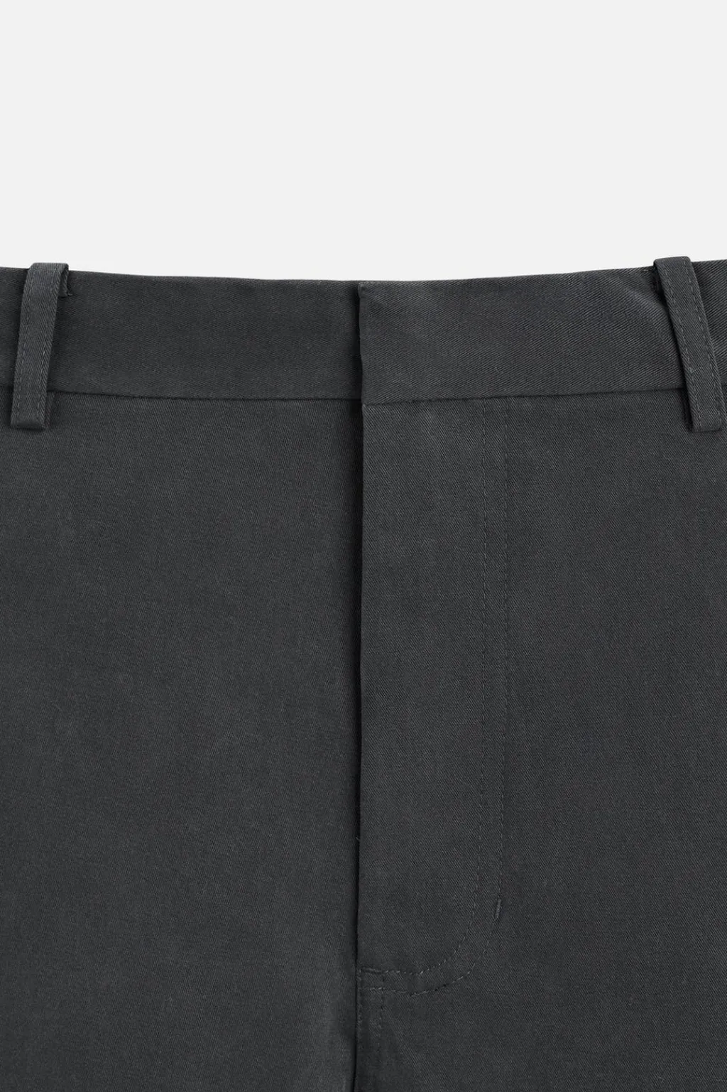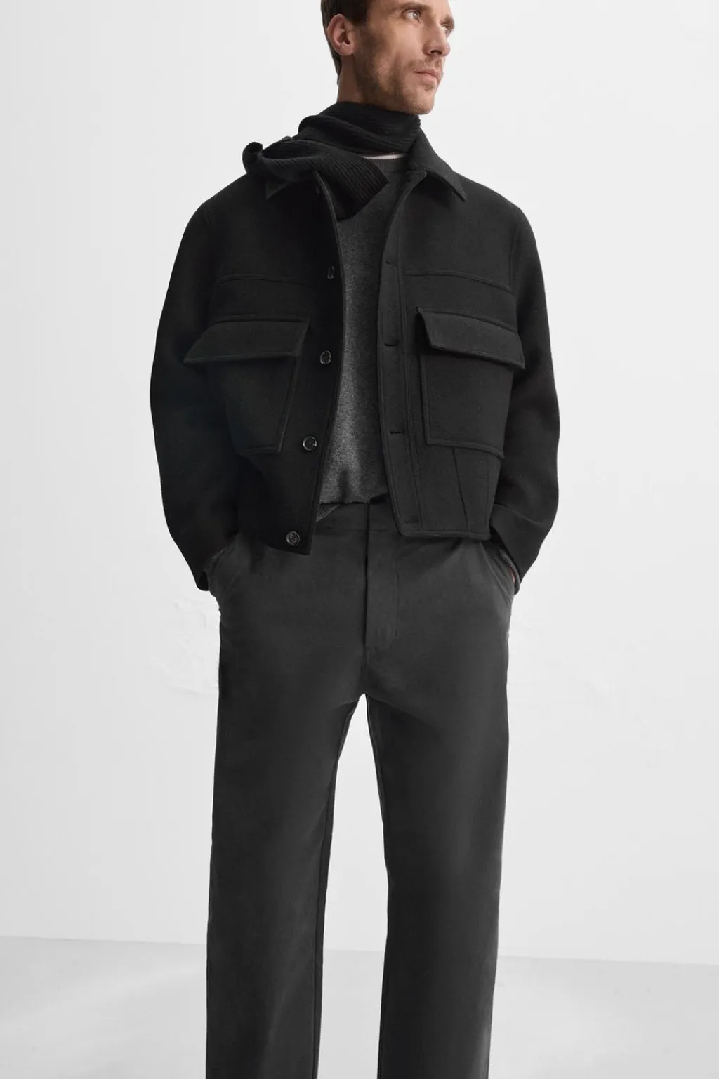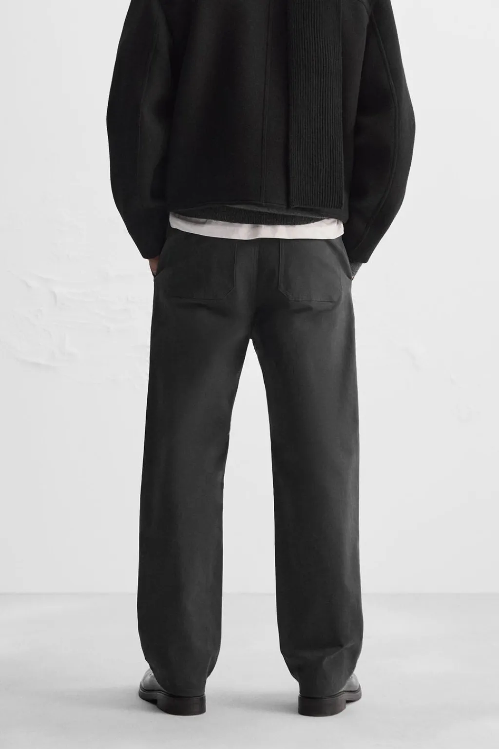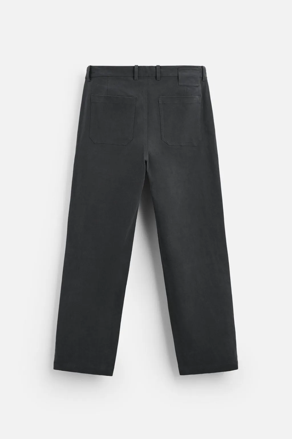 Pantalón straight fit confeccionado en tejido con tacto suave. Bolsillos frontales y detalle de bolsillos traseros de plastrón. Cierre frontal con cremallera y botón.