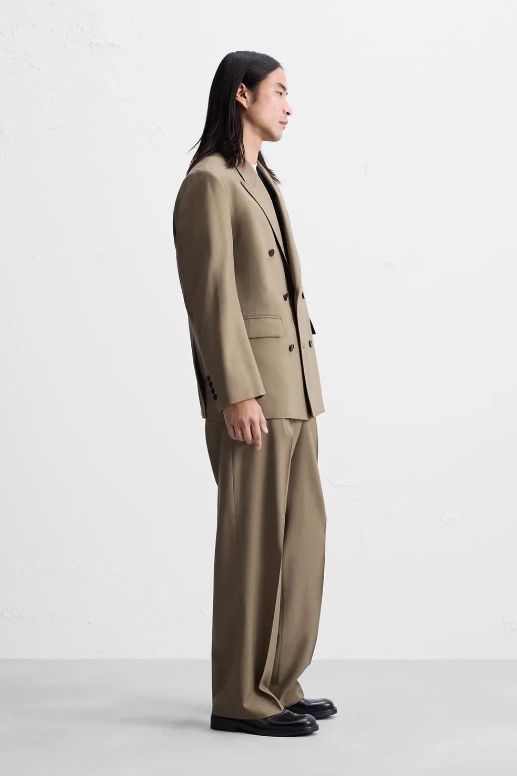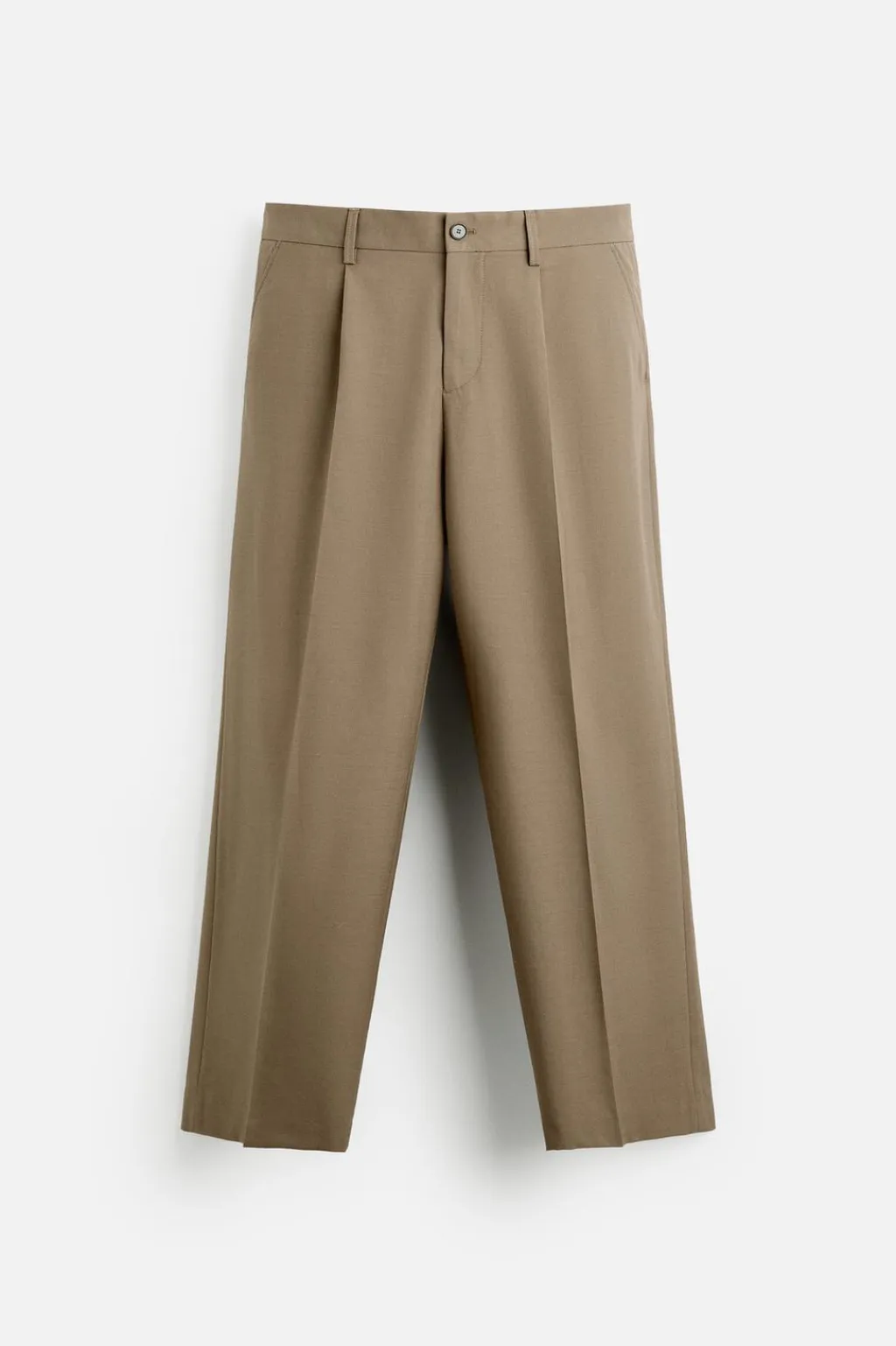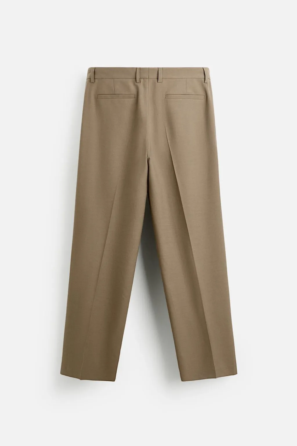 Pantalón straight fit confeccionado en tejido con lana. Cintura con detalle de pliegues en delantero. Bolsillos frontales y detalle de bolsillos traseros de vivo. Cierre frontal con cremallera y botón.