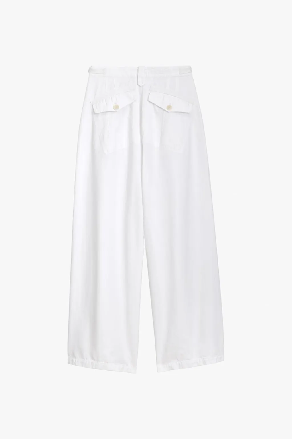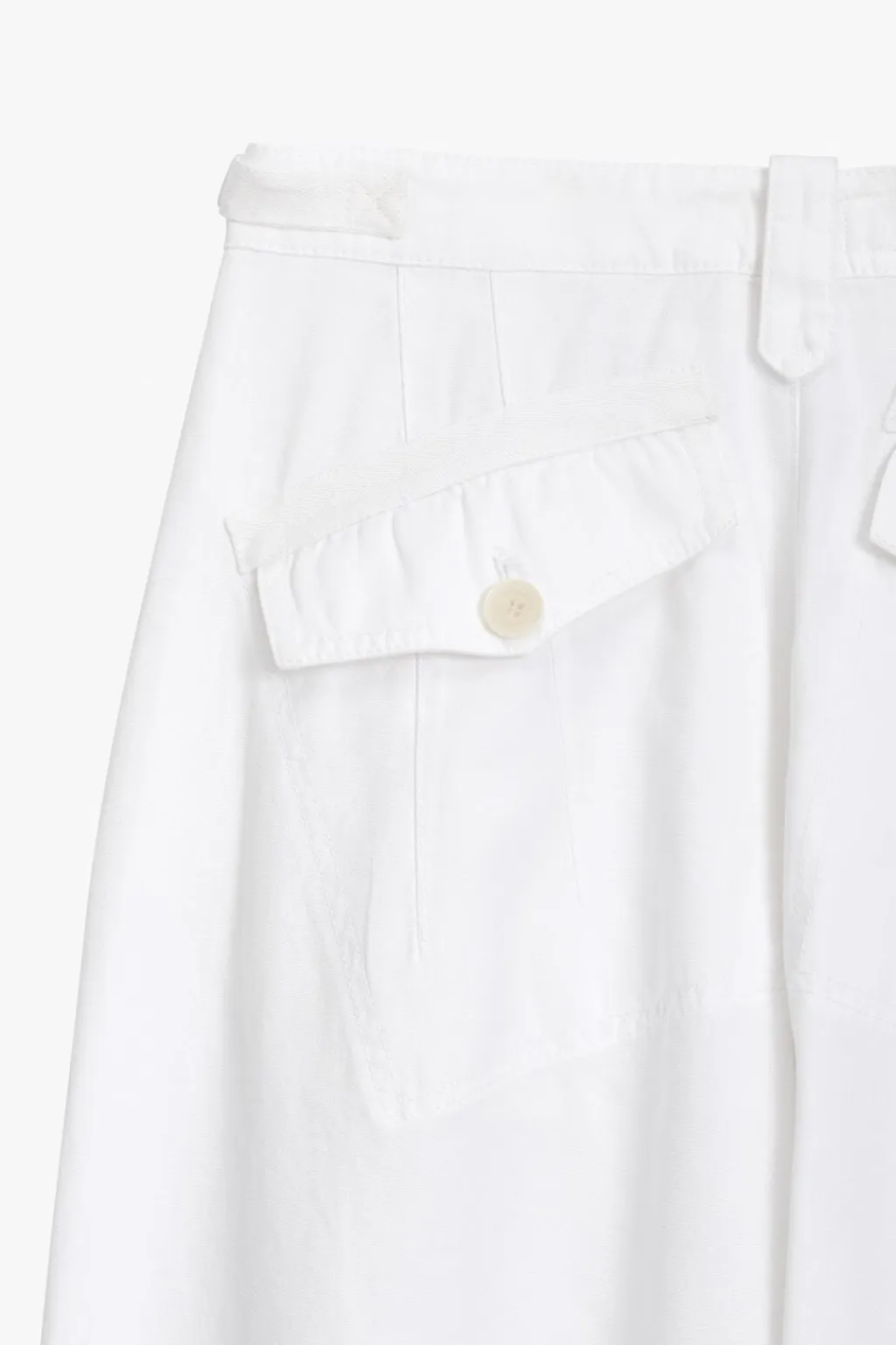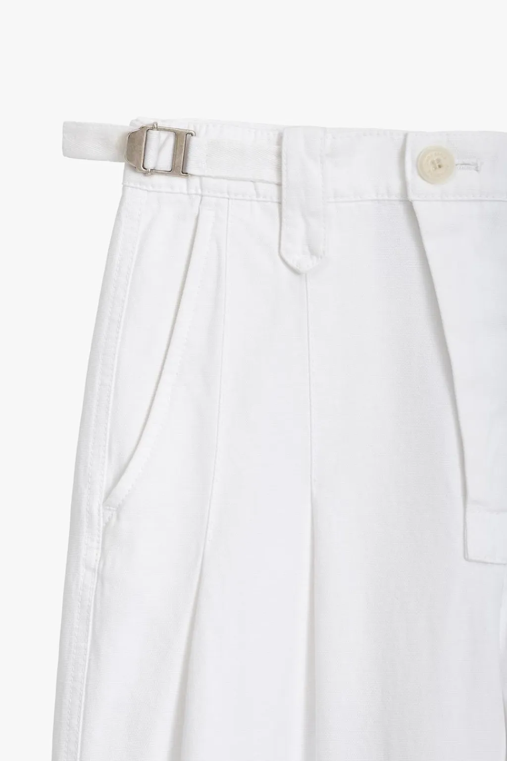 Pantalón culotte de tiro medio confeccionado en hilatura de algodón 100%. Cintura con trabillas y ajustable con cinta y hebilla metálica. Bolsillos en delantero y de plastrón con solapa en espalda. Detalle de pinzas frontales. Pierna ancha. Cierre frontal con cremallera y botones.