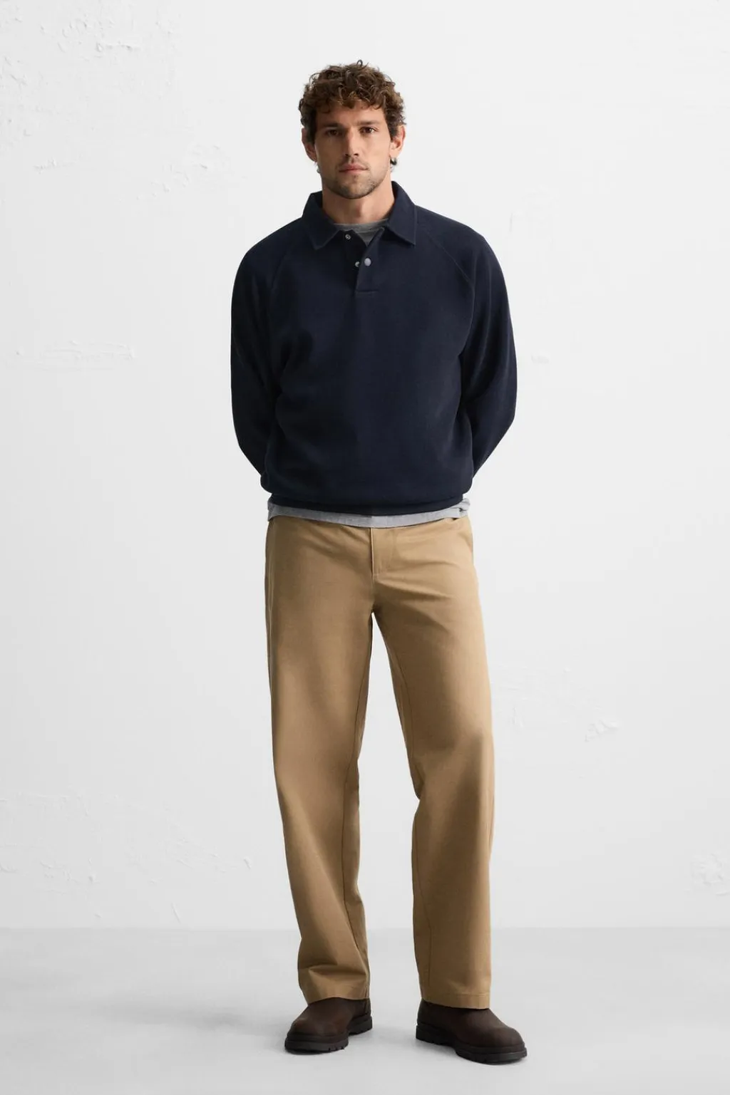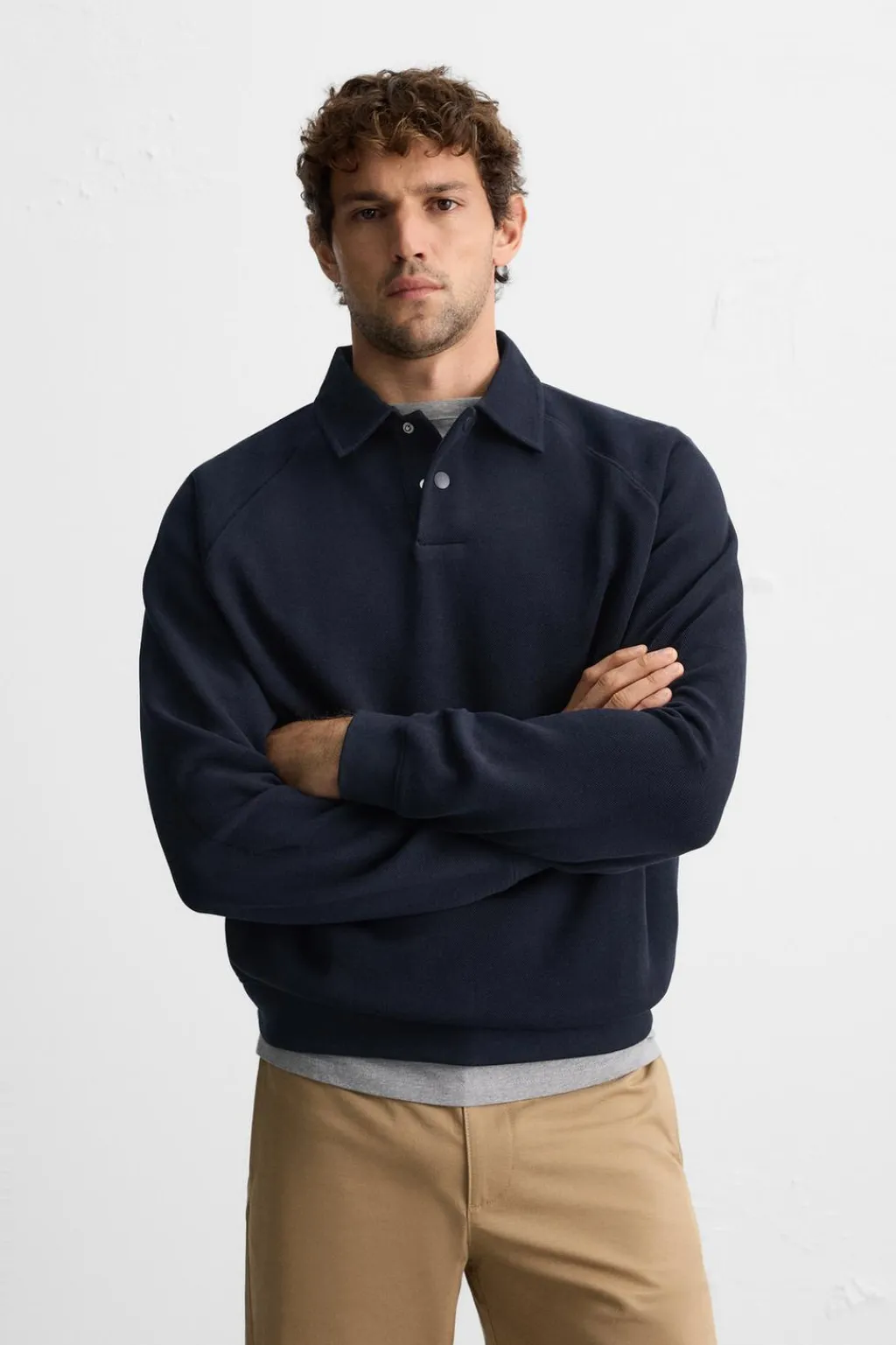 Polo relaxed fit confeccionada en tejido de algodón con elasticidad. Cuello solapa con cierre frontal de botones a presión. Manga larga. Acabados en rib.