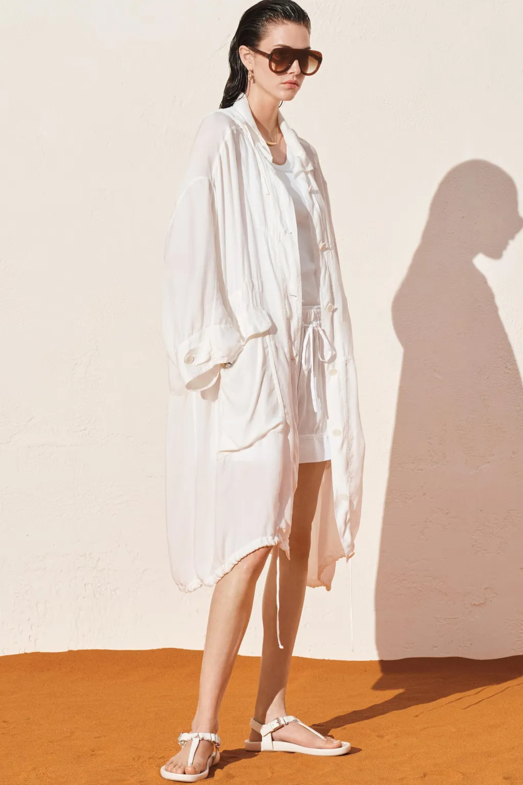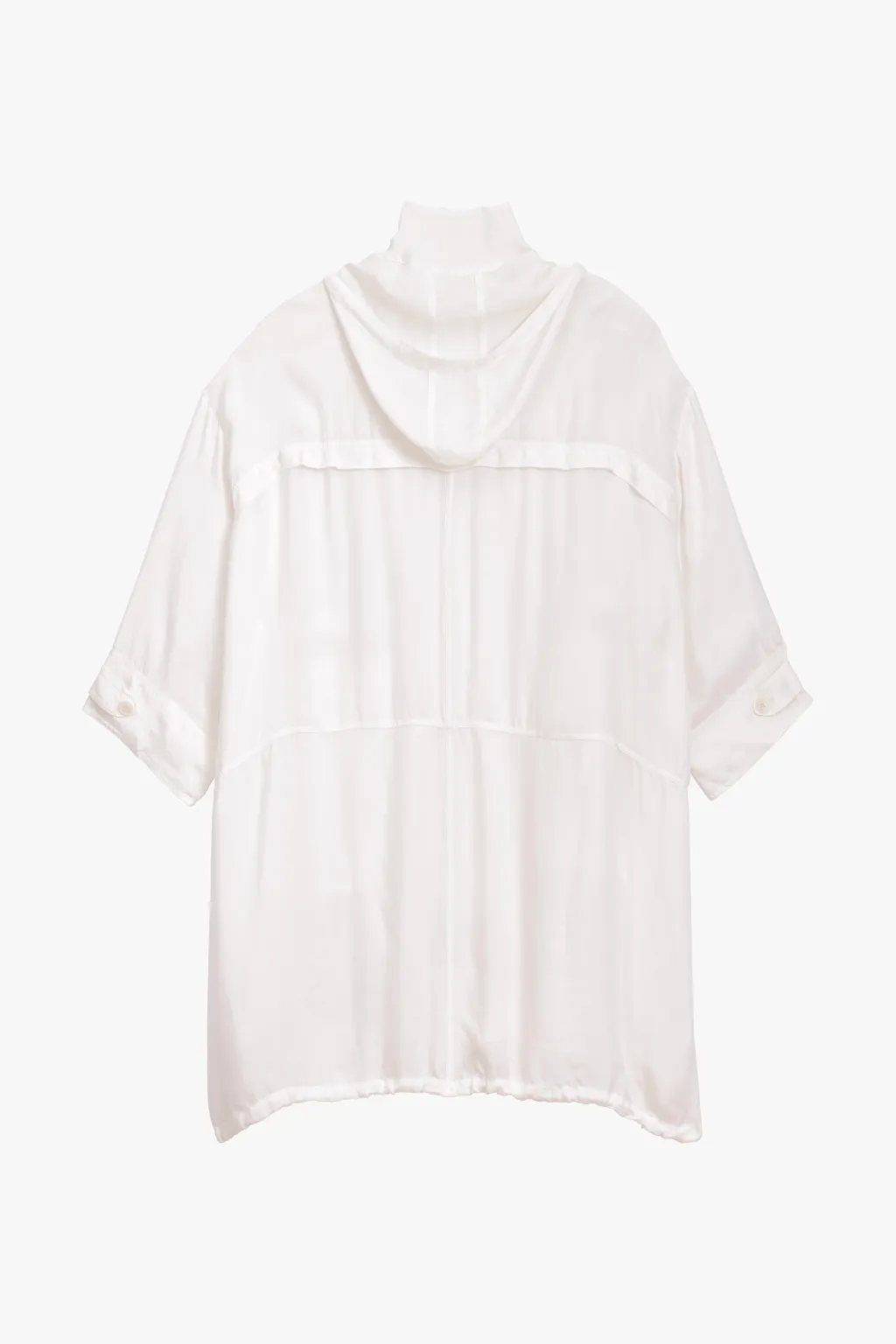 Parka fluida confeccionada en hilatura de cupro 100%. Capucha ajustable con cordones y manga larga acabada con trabilla y botón. Bolsillos con solapa en delantero. Cintura ajustable con cordón interior. Detalle de pespuntes marcados combinados a tono. Bajo ajustable con cordones. Cierre frontal con botones.