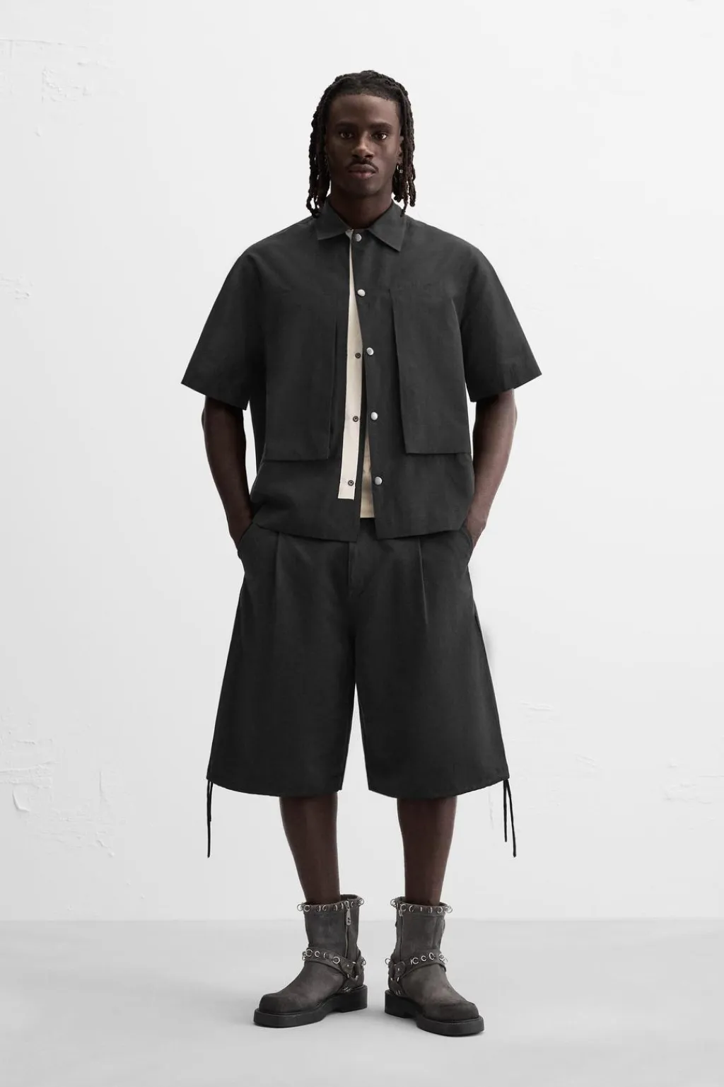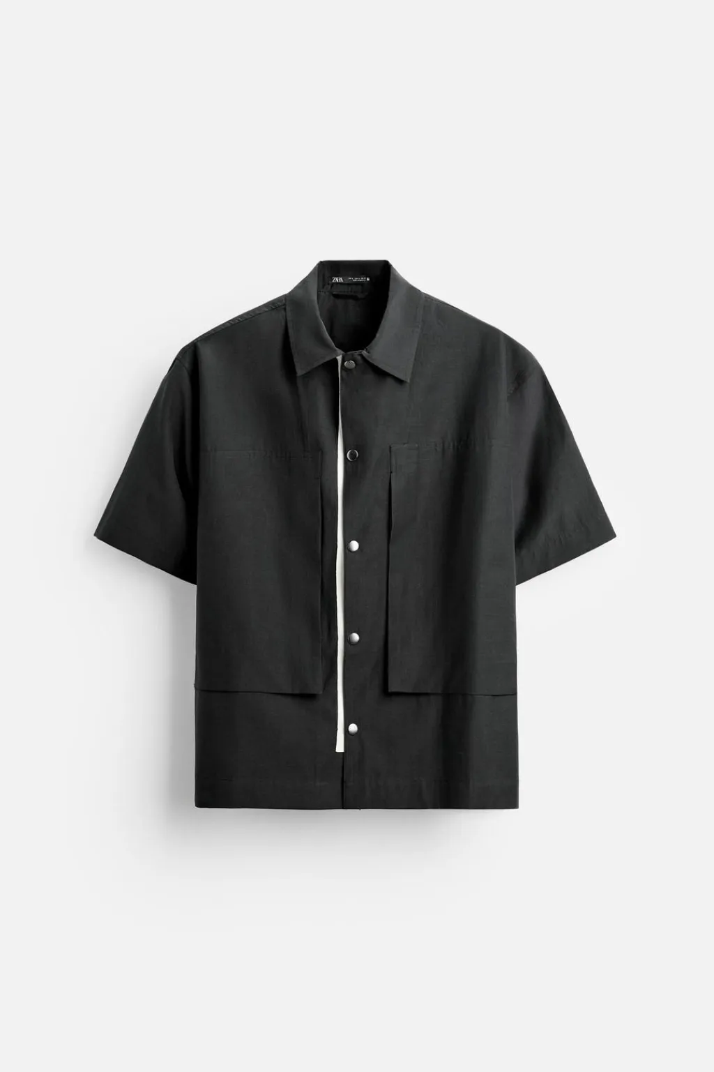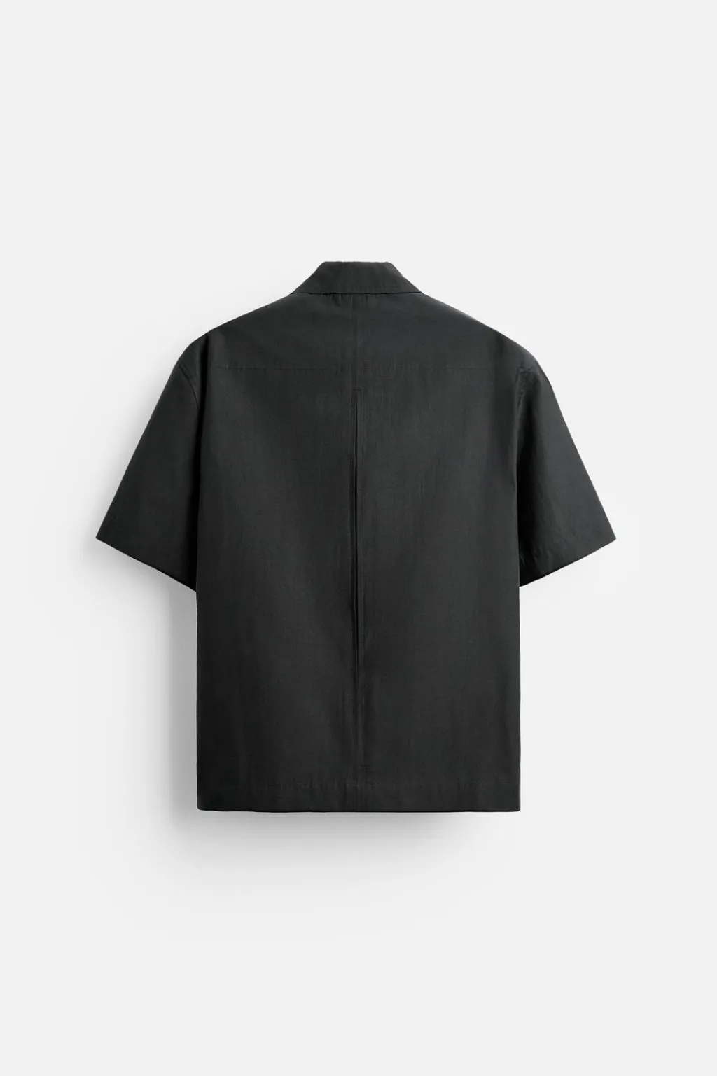 Sobrecamisa relaxed fit confeccionada en tejido con mezcla de algodón. Cuello solapa y manga corta. Bolsillos plastrón en delantero. Cierre frontal de botonadura.