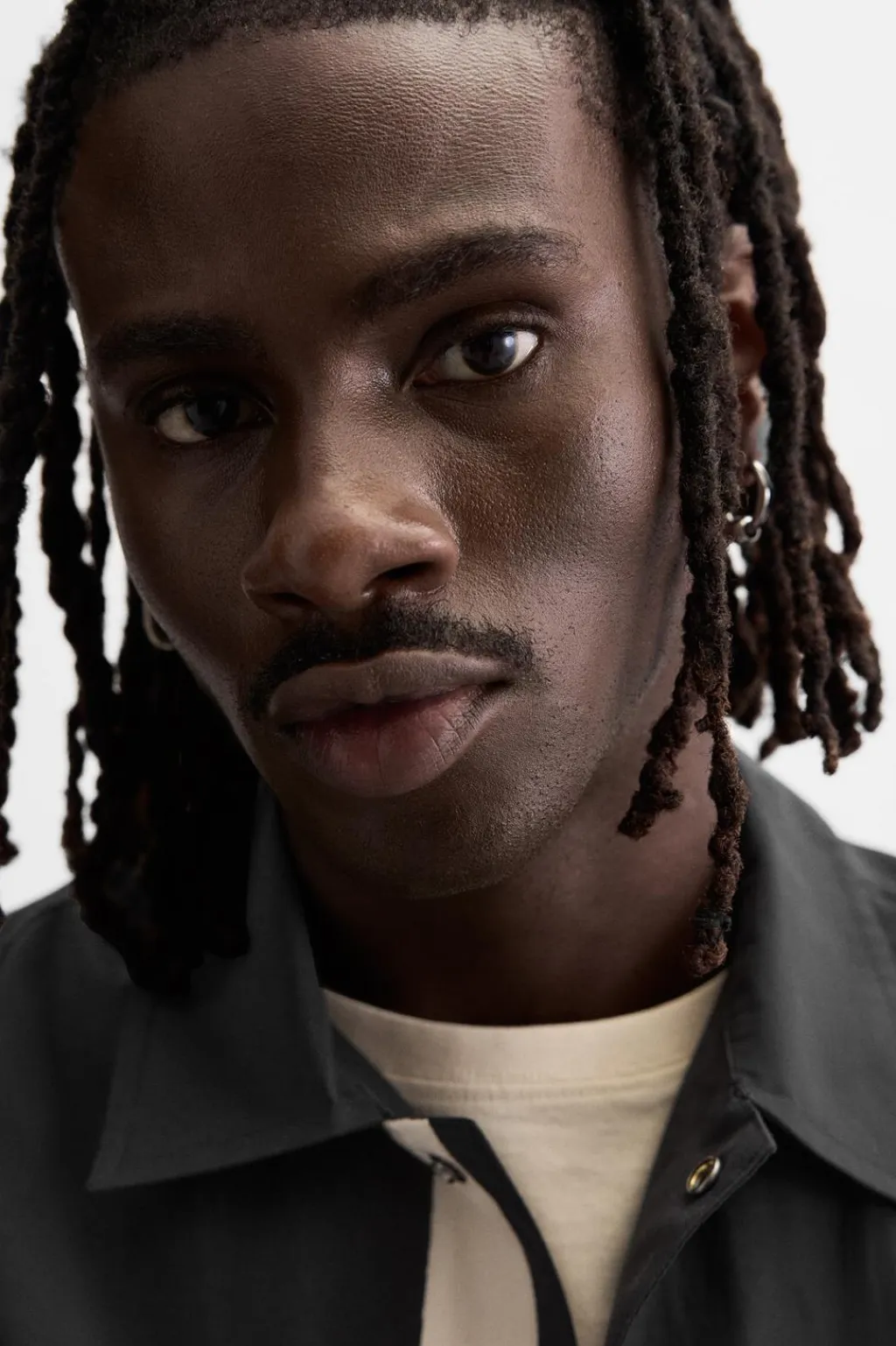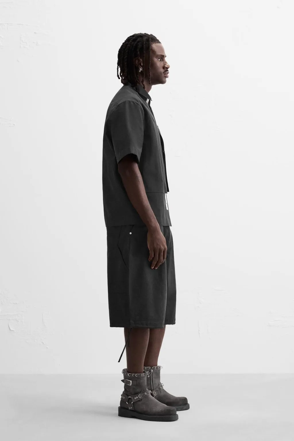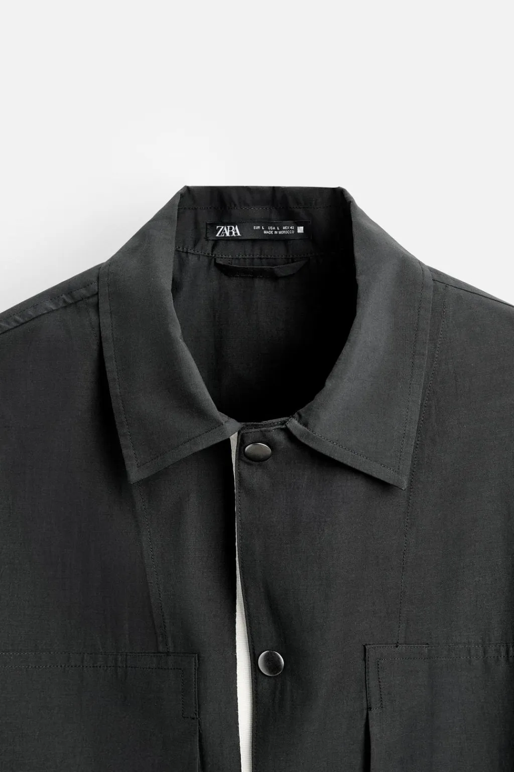 Sobrecamisa relaxed fit confeccionada en tejido con mezcla de algodón. Cuello solapa y manga corta. Bolsillos plastrón en delantero. Cierre frontal de botonadura.