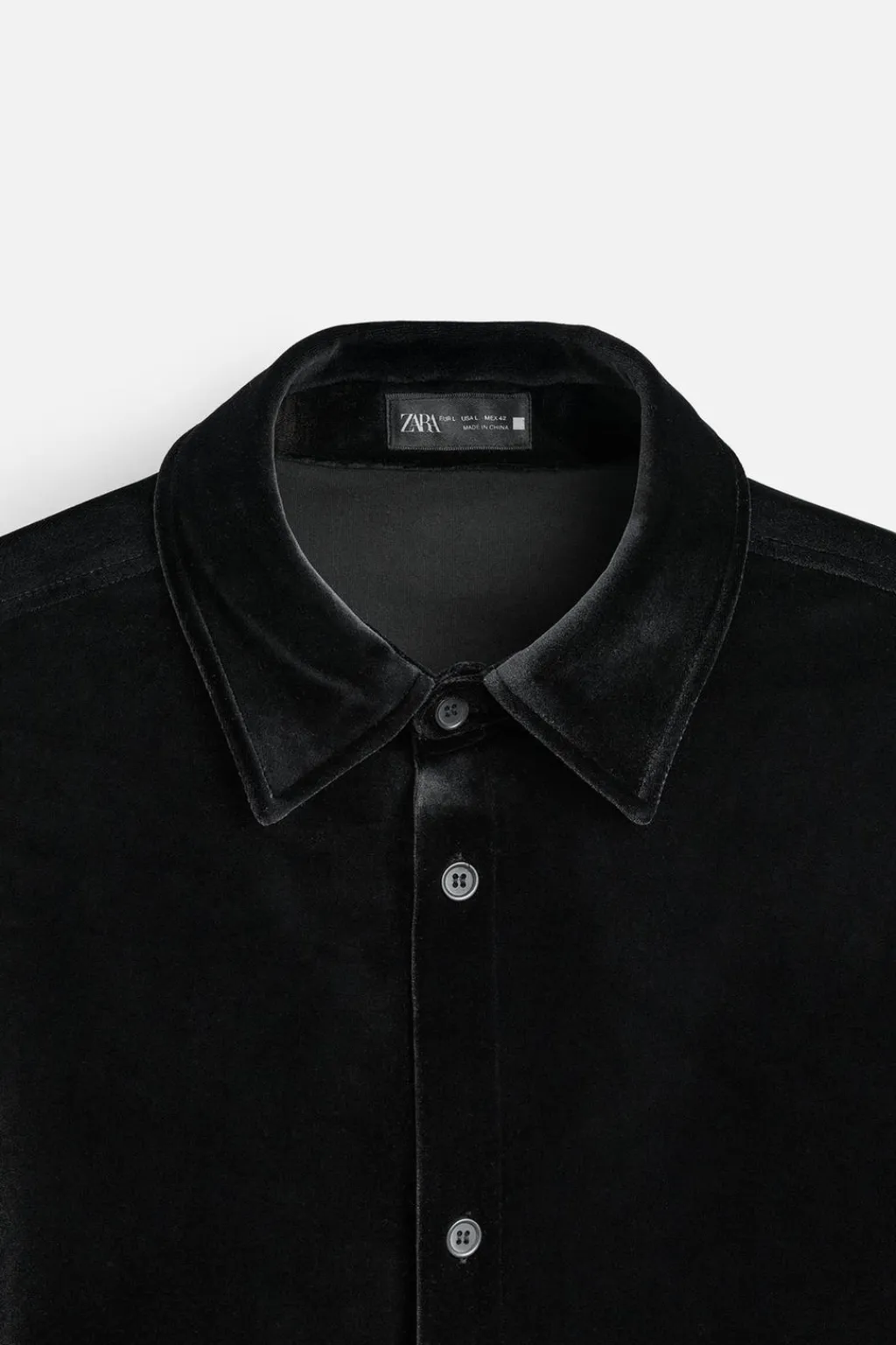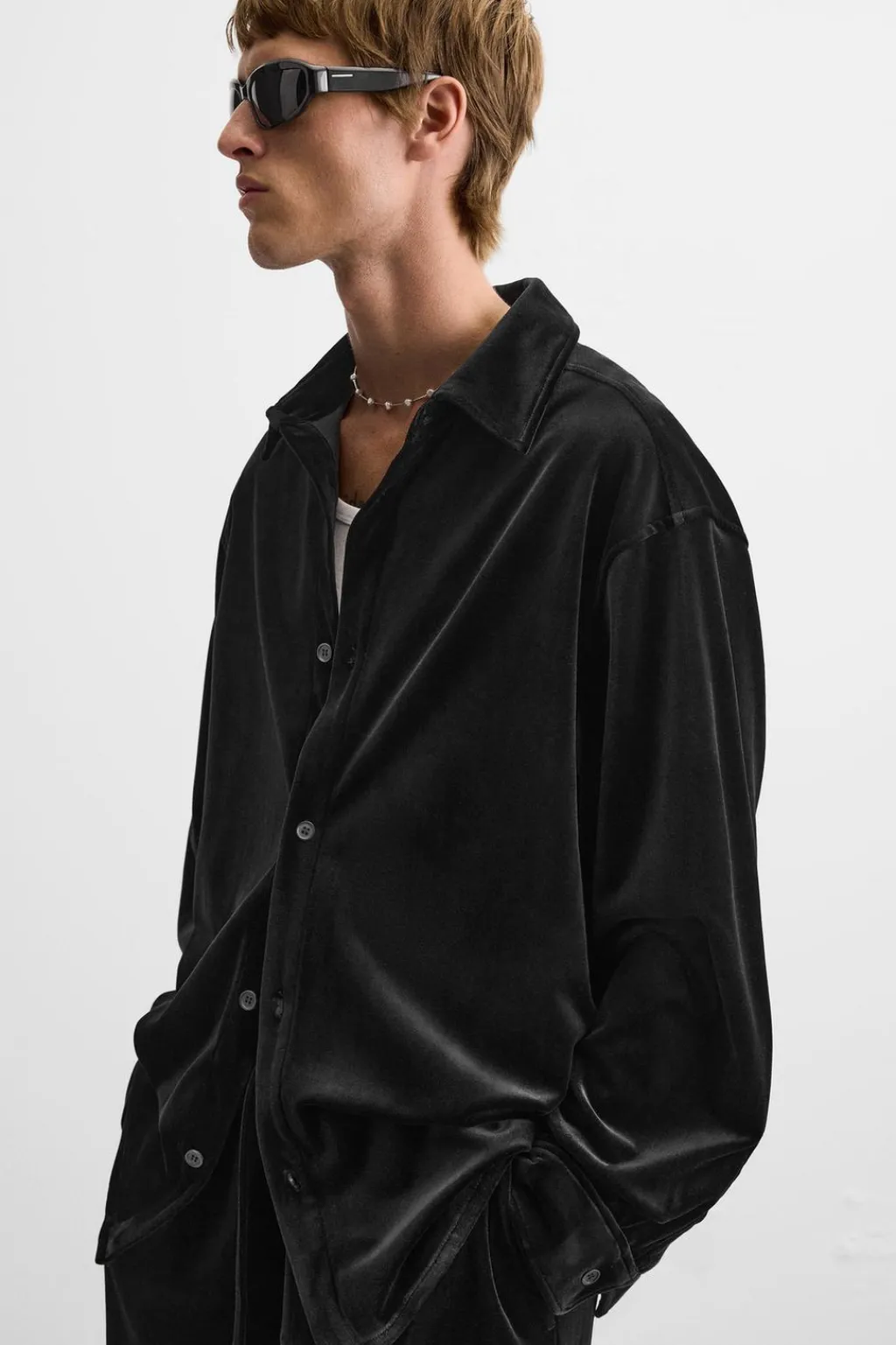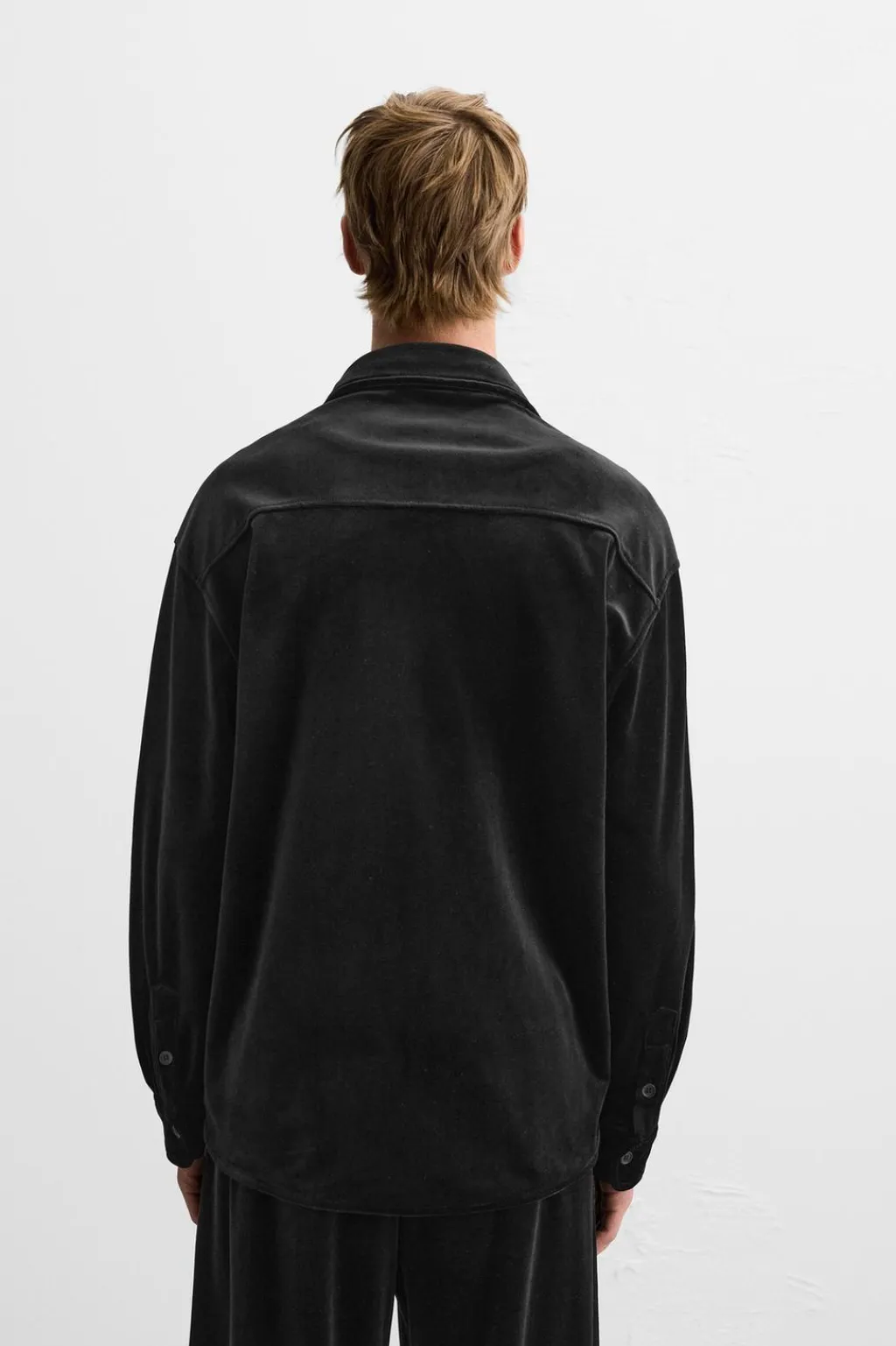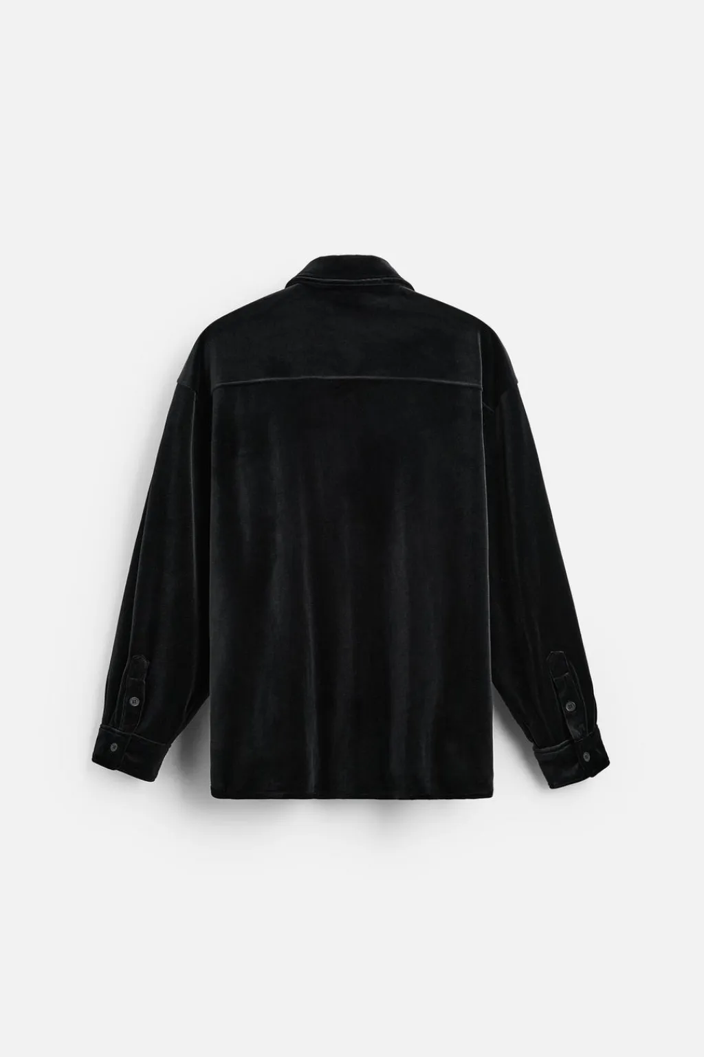 Sobrecamisa relaxed fit confeccionada en tejido con acabado terciopelo. Cuello italiano y manga larga acabada en puño con botones. Cierre frontal de botonadura.